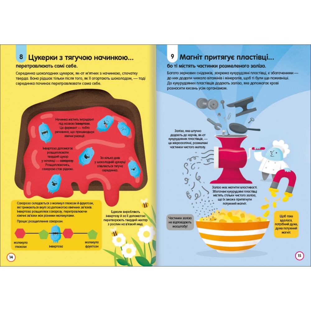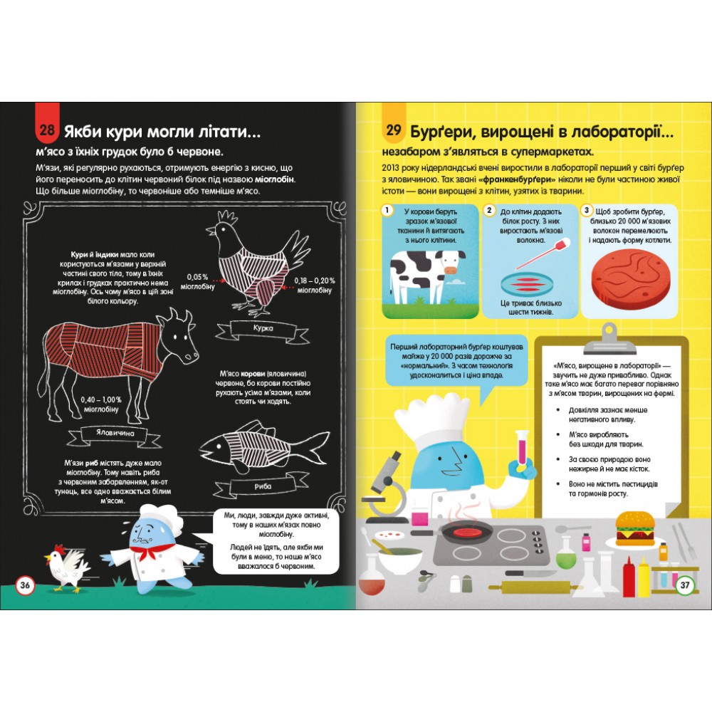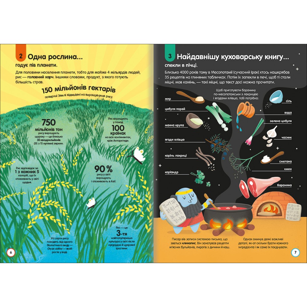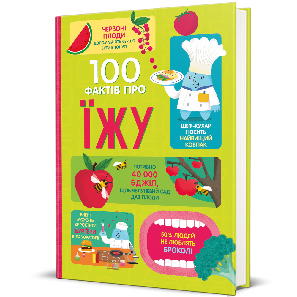 «100 фактів про їжу» —дитяча енциклопедія про їжу, її технології виробництва, а також неочікуванні відкриття. Всередині не лише цікаві факти про продукти, які ми вживаємо у їжу, історію страв чи дивні смакові вподобання історичних особистостей, а й потрібна базова інформація про поживні речовини, вітаміни, особливості тих чи інших продуктів.