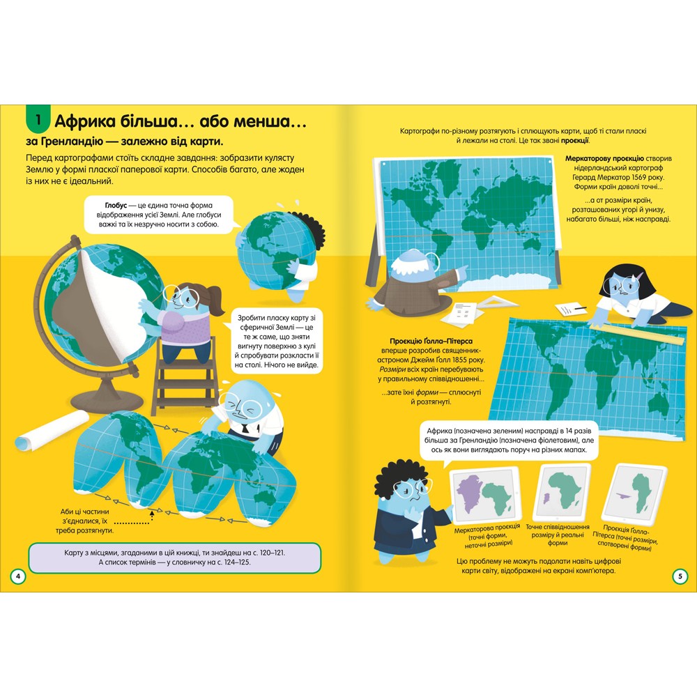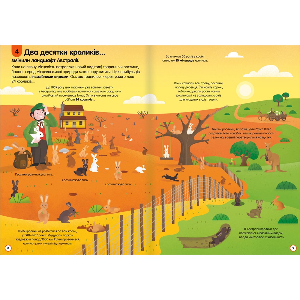 Як два десятки кроликів змогли змінити ландшафт Австралії, а зграя вовків змінила русло річки? Як завдяки тіням і одному верблюду можна дізнатись розмір Землі? А скільки відсотків питної води на Землі? Що важче – всі бактерії чи всі люди? Які дерева є сором’язливими? Де на Землі можна відчути себе, як на Марсі? Чи може пісок свистіти та ревіти? Чому Земля не може без Місяця? Які матеріали та породи створили люди і чим вони небезпечні? Чому в Арктиці завжди холодно? Які істоти живуть у льодовиках? Як графіті може врятувати дзьобогруду черепаху? Що допомагає спрогнозуватии погоду? Відповіді на ці та чимало інших запитань можна дізнатись у цьому пізнавальному виданні.