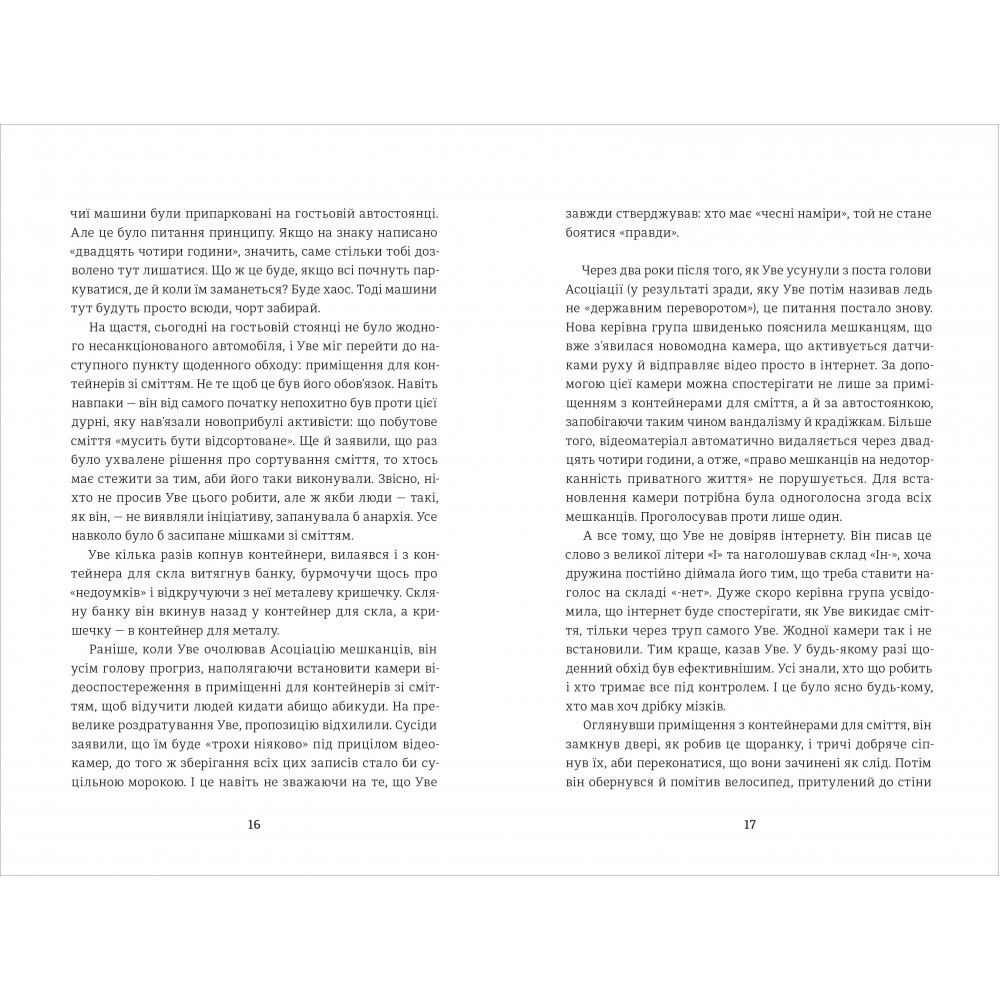 Це моє перше знайомство із Бакманом. І це знайомство неймовірно чудове. Цей роман змусив мене плакати, а ще сміятись, але плакати частіше. Неймовірно зворушлива історія чоловіка на ім'я Уве, яка змушує задуматись: "А чи варто взагалі ображатися на свого сусіда буркутуна, можливо за його буркотінням і занудством приховується щімка історія його життя...". Цей роман не дарма є настільки популярним і вже має не одну екранізацію. Однозначна рекомендація до читання. Запевняю, що прочитане не відпустить вас ще довго