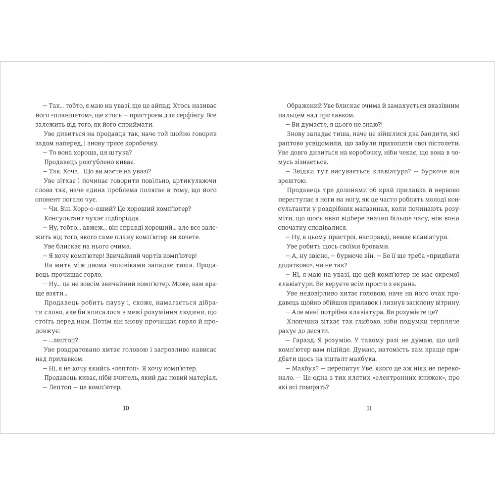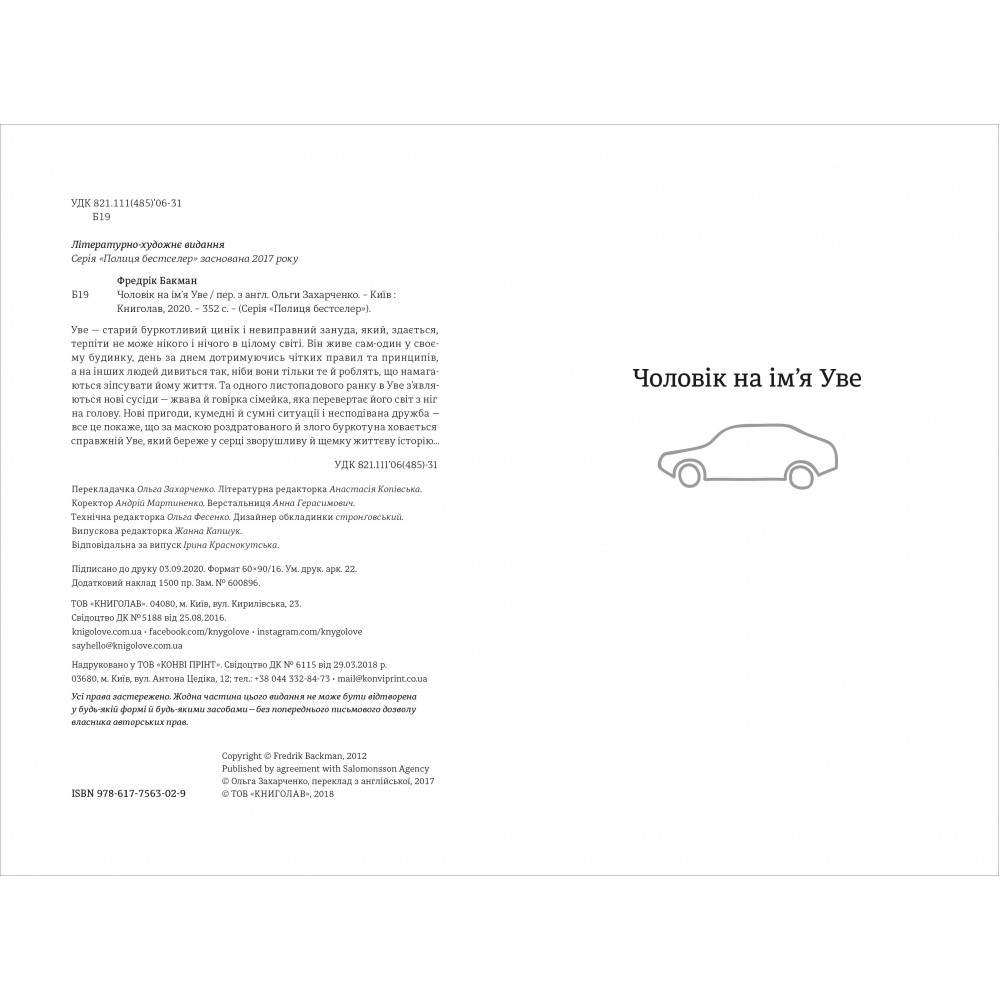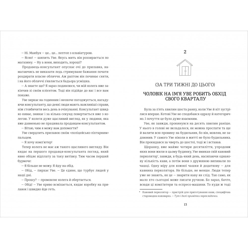 Роман «Чоловік на ім'я Уве» - літературний дебют популярного шведського журналіста, блогера Фредріка Бакмана. Книжка вийшла у 2012 році. На сьогодні продано більше п'яти мільйонів примірників. Роман «Чоловік на ім'я Уве» - смішна, іронічна, зворушлива та мудра історія про людей, які через ті чи інші причини стали непотрібні суспільству. Твір про щоденну мужність жити і бути собою. Уве - добрий буркотун, якого неодноразово випробовувала доля. Вийшовши на пенсію, втративши кохану дружину, він змушений наново відшукувати сенс буття. Та чи хоче цього Уве? Яким би сумним не був його вибір, на чоловіка чекає ще багато любові, дружби і пригод. У Швеції книжку було екранізовано, фільм за романом Бакмана входить до списку найпопулярніших стрічок країни всіх часів. Роман став бестселером за версією New York Times, отримавши схвальні відгуки як літературних оглядачів, так і читачів.