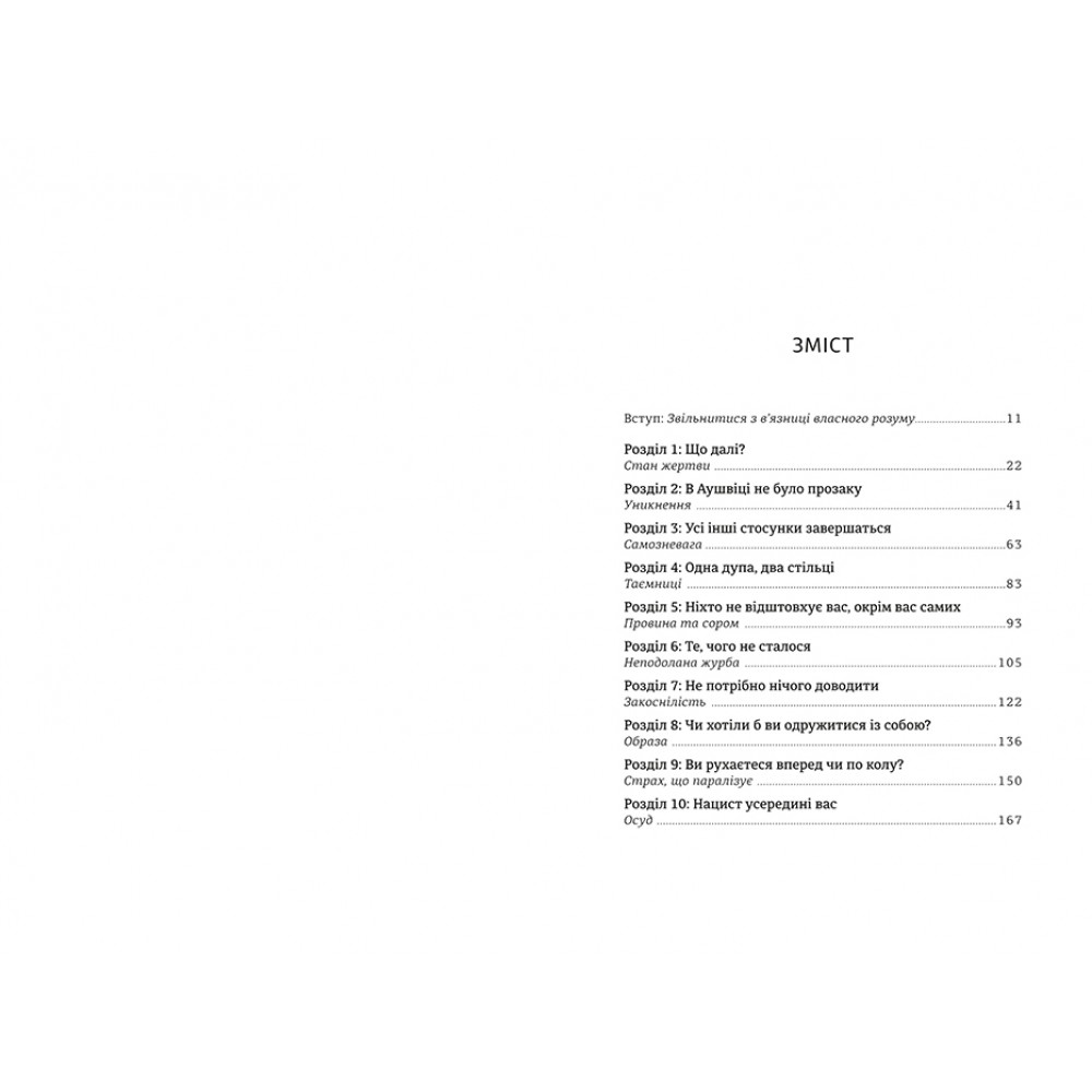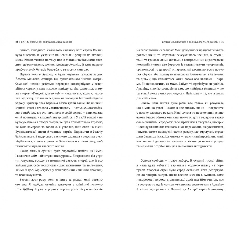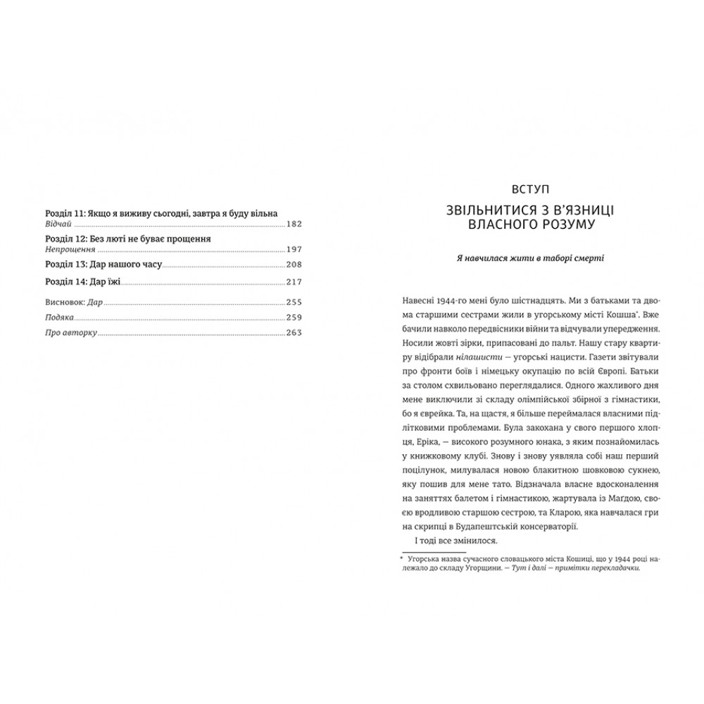 У кожному розділі докторка Еґер ділиться історіями з власного життя та історіями своїх пацієнтів, а в кінці пропонує ключі до звільнення від проблеми. Це установки, вправи або питання, які допоможуть знайти шлях з наших ментальних в’язниць до свободи і радіти життю.