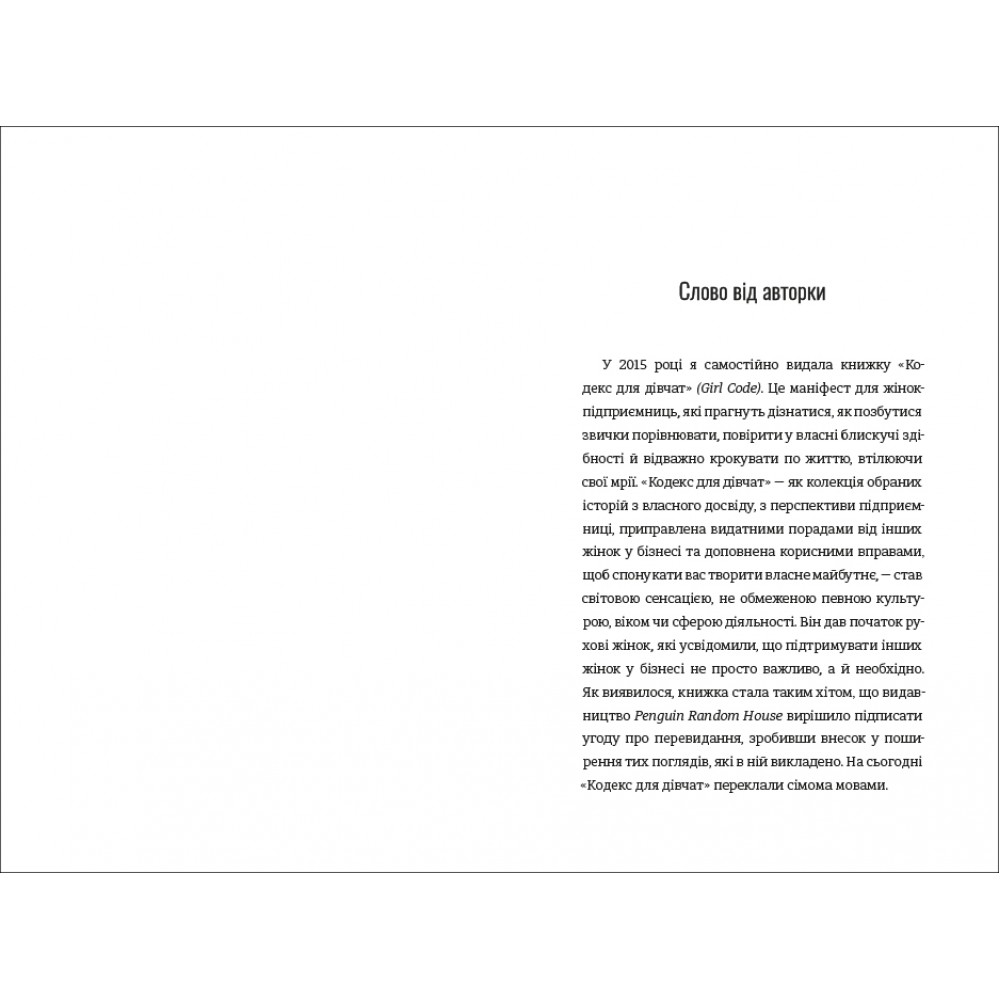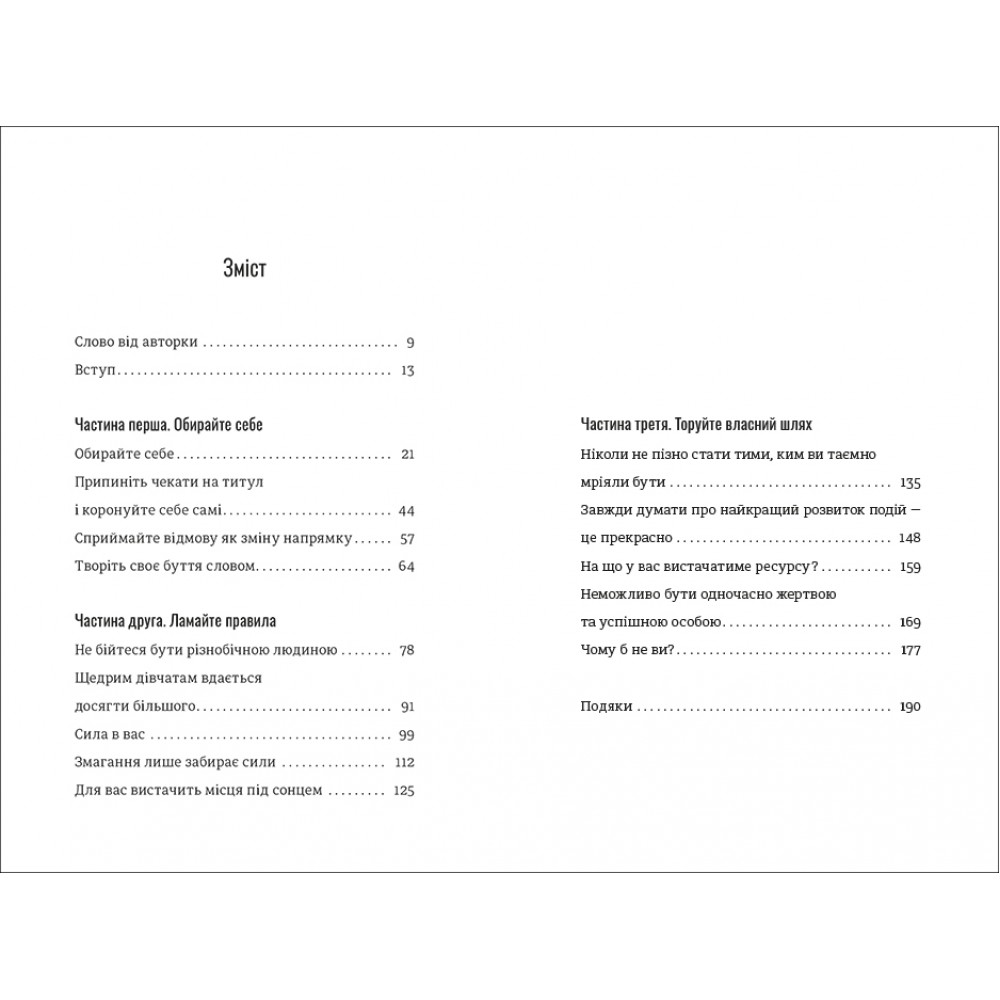 Ця книжка може бути інструкцією з того, як видати книжку або інструкцією з пошуку нового місця роботи, чи нового хобі, одним словом, вона про те, як взяти себе в руки і наважитись на зміни. Цей мотиваційний і практичний нон-фікшн допоможе дівчатам, які хочуть реалізуватись в улюбленій справі.