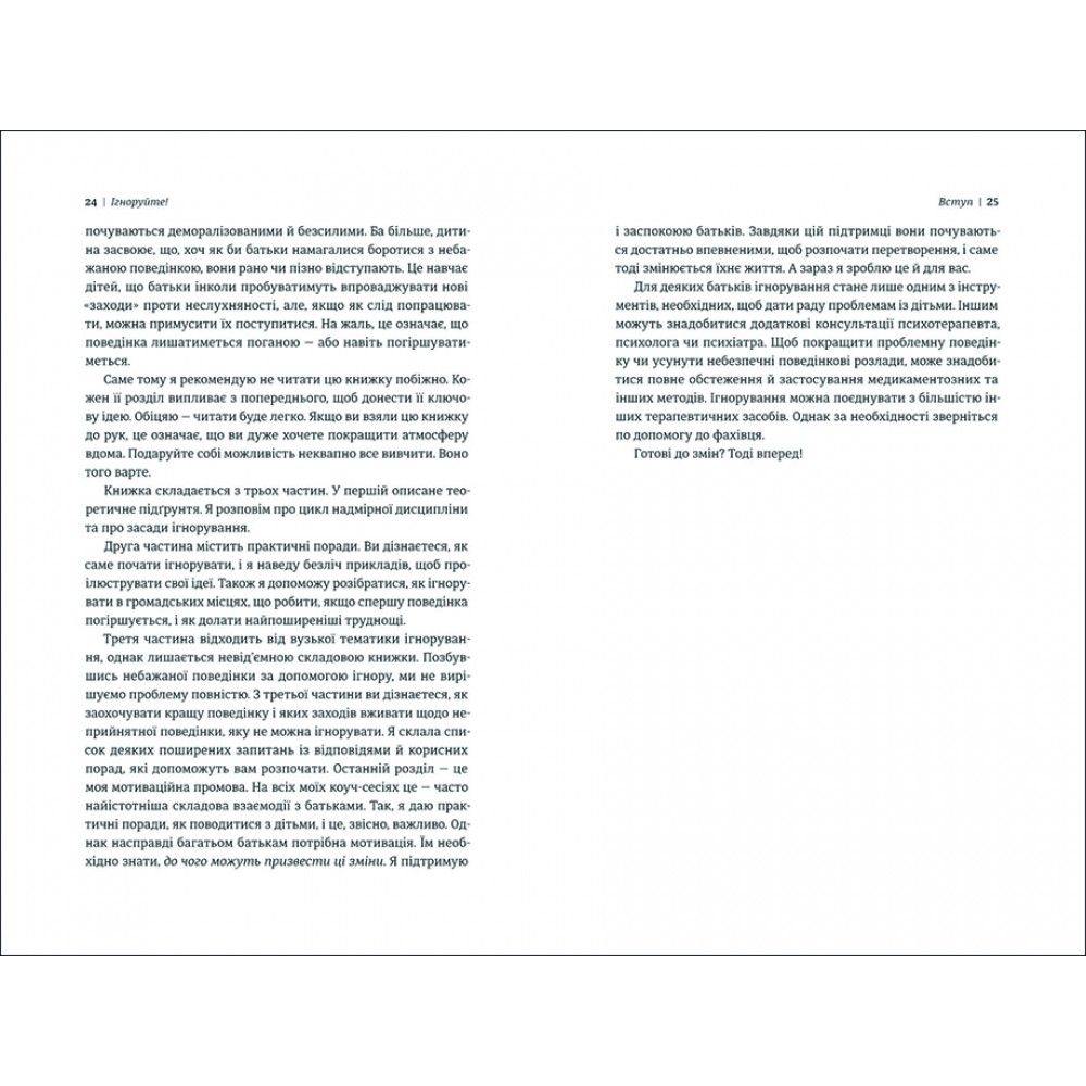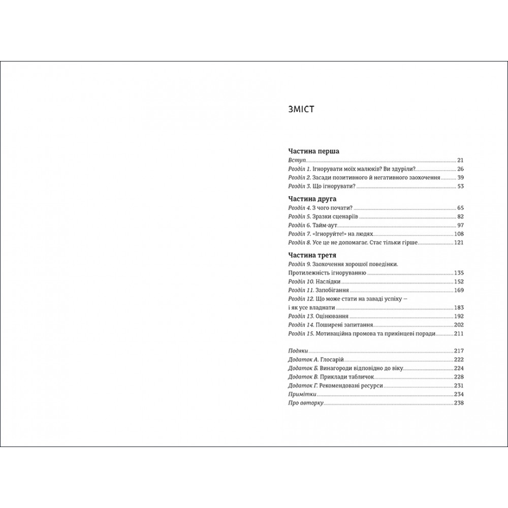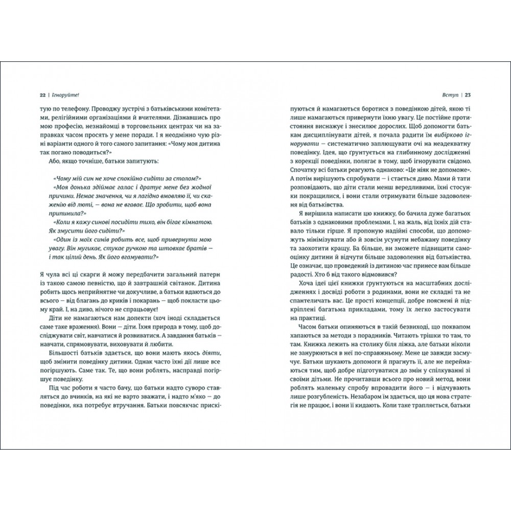 Ця книга вчить розчарованих, схильних до стресу батьків, що вибіркове ігнорування певних типів поведінки може дійсно надихнути на позитивні зміни в поведінці їх дітей. З усім ниттям, скаргами, благаннями і переговорами, виховання може здатися швидше покаранням, ніж задоволенням. Доктор Кетрін Перлман, колумніст і один з провідних американських експертів щодо виховання дітей, має просте, але несподіване рішення: Ігнорувати! Чотирьохетапний процес доктора Перлман повертає радість у виховання дітей. Використовуючи ефективні стратегії і випробувані на практиці підходи, вона вчить батьків новій поведінці. Занадто часто ми перебуваємо в переговорах, суперечках з дітьми. У підсумку, замість поліпшення, подібна поведінка буде не тільки тривати, але і часто має тенденцію погіршуватися. Коли діти не отримують ніякої уваги або винагороди за неправильну поведінку, вони розуміють, що їх способи діяти неефективні і перестають це робити. Використовуючи перевірені стратегії підтримувані дослідженнями, ця книга показує батькам, як уникати участі в боротьбі за владу, припинити використовувати увагу в якості нагороди за неправильну поведінку, пропонує ефективні поведінкові методи модифікації для зменшення, а часто і усунення проблеми в поведінці. Чому варто купити книгу "Ігноруйте! Щасливе виховання без надмірного контролю" Кетрін Перлман? "Ігноруйте! Щасливе виховання без надмірного контролю" - ця книга переповнена мудрістю, порадами, сценаріями і часто вживаними питаннями. Це програма виховання дітей, яка обіцяє повернути блаженство в життя роздратованих батьків.