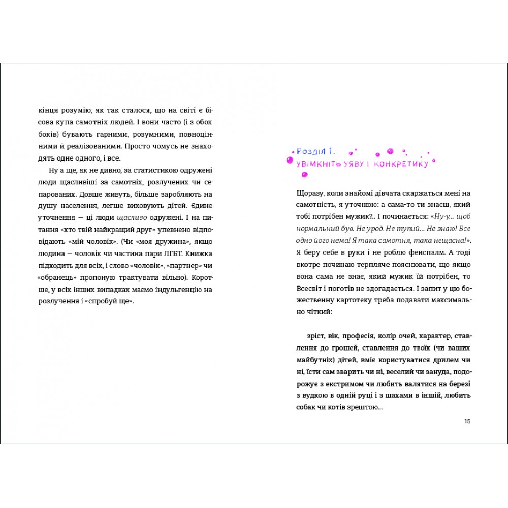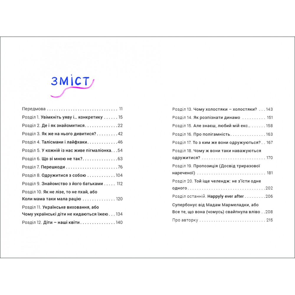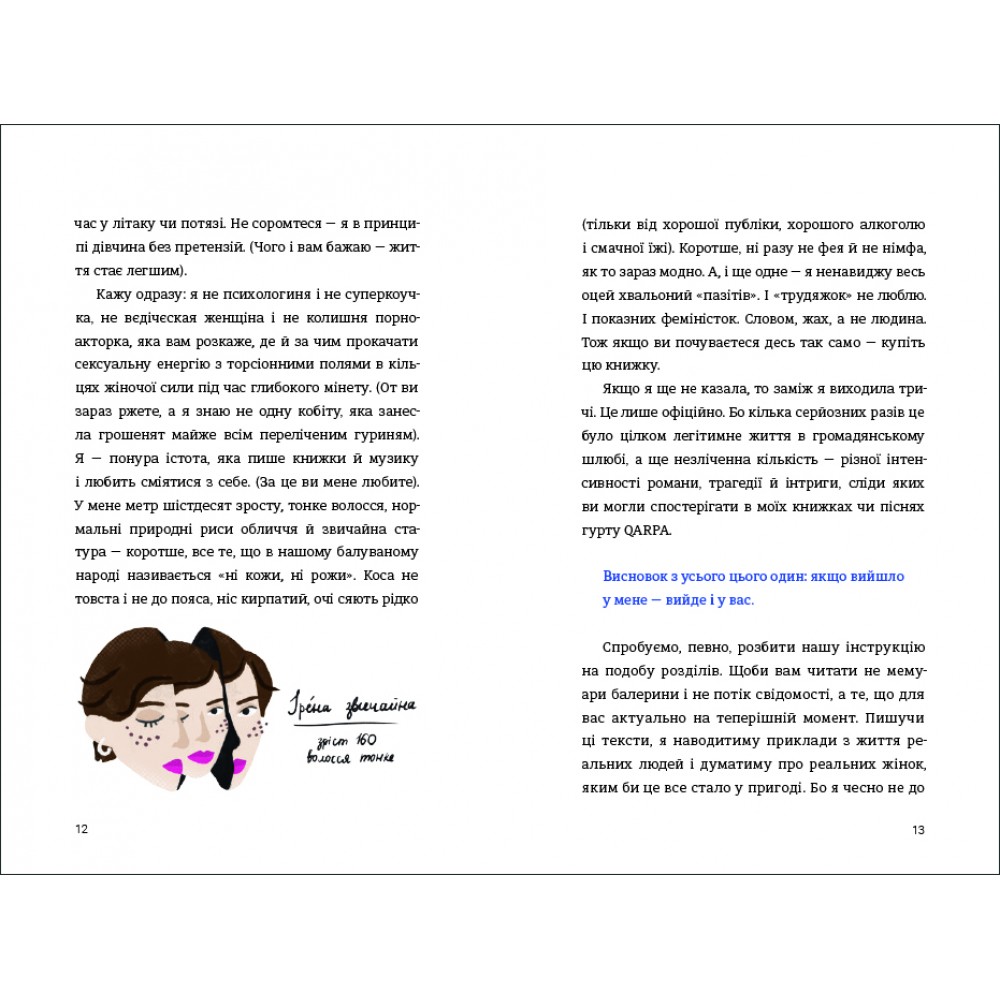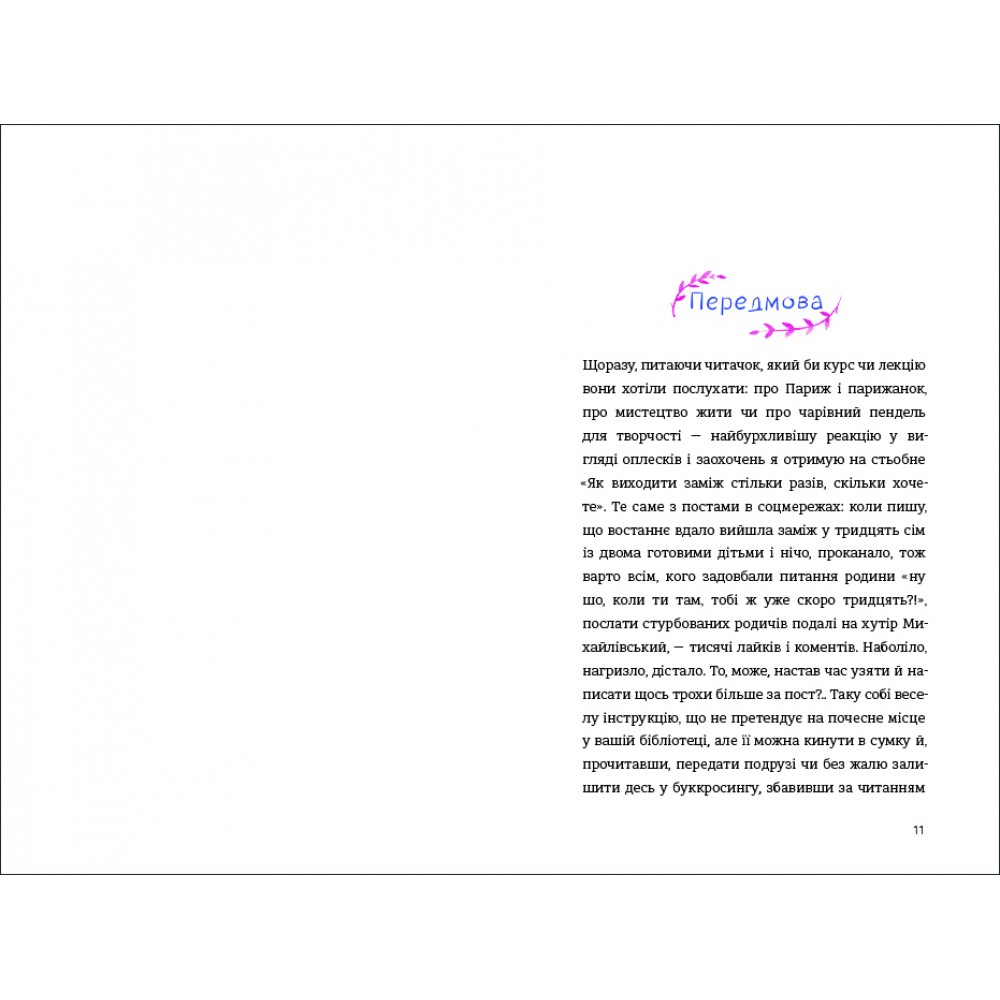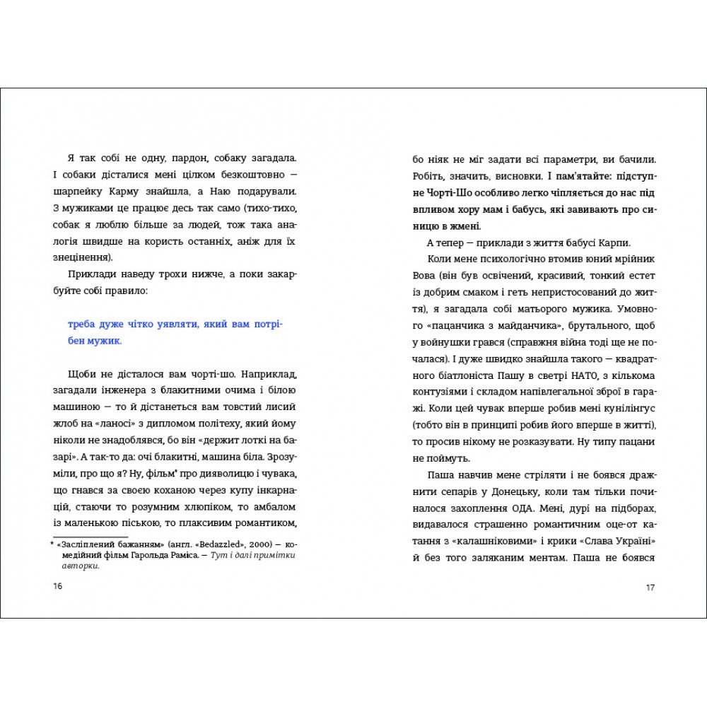 Крім того, письменниця наголошує, що не прагне займатися менторством і вдавати з себе гуриню й психологиню, її книжка – це всуціль життєвий досвід і висновки з її досвіду стосунків із чоловіками.