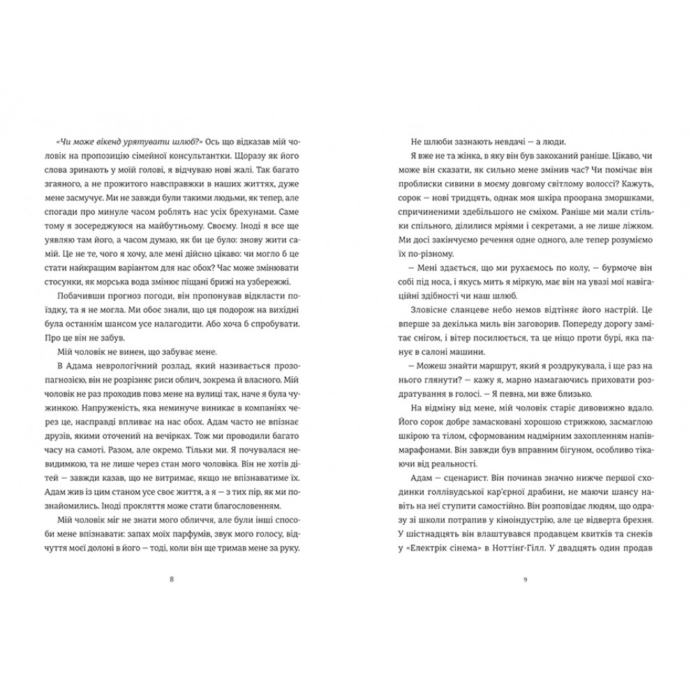 Історія про подорож подружньої пари на вікенд до Шотландії, брак якої зазнає чергової кризи. Купа сімейних проблем, він пише сценарії, вона зооволонтер. Їхній брак тріщить по швам і тут дружина отримує на роботі подарунок, подорож, щоб провести час вдвох. Авторка інтригує читача, постійно спонукаючи відкривати читати новий розділ, тому книга "проковтнулась" дуже швидко. Постійні секрети подружжя, образи одне на одного, листи десятилітнього браку, дивна хвороба чоловіка на нерозпізнаваність рис облич.