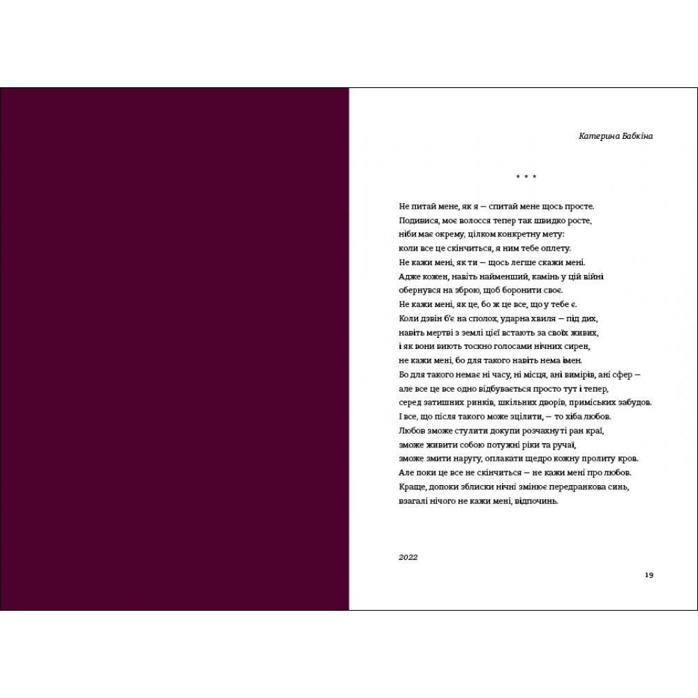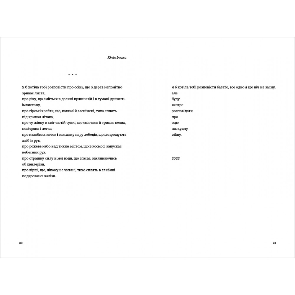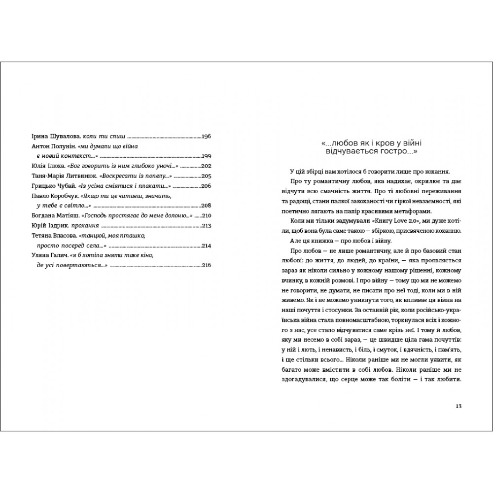 «Книга Love 2.0. Любов і війна» — це розмаїття щемких історій, художніх образів та поетичних рефлексій, які вплітаються у спільну канву проживання війни. Ці вірші вміщують у собі цілий спектр емоцій і почуттів: кохання і ненависть, пристрасть і лють, ніжність доторків і смуток від розлуки, віру в любов і біль від утрати. Це поезія про темряву, що накриває з приходом ворога, і про світло, яке мусить перемогти.
