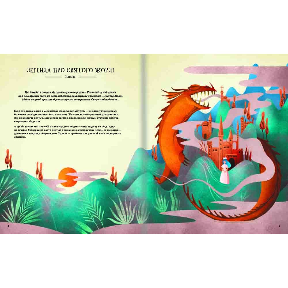 Тут є легенда про португальську драконицю на ім’я Кука, про Тараска і святу Марту з Франції, про червоного дракона, який красується на прапорі Уельса, один італійський дракон розповів про Святого Джуліо і дракона з Італії, про жадібного дракона із Скандинавії та про славнозвісного Вавельського дракона, який набридав мешканцям Кракова. А ще тут йдеться про шарканів, драконів, які мешкали в Угорщині, про драконів із казкової Індії та веселих і добрих драконів з Китаю, про Імуґі, який жив у Кореї і міг справджувати бажання, про двох впертих драконів з Перу та про Змія, який жив колись в Київській Русі.