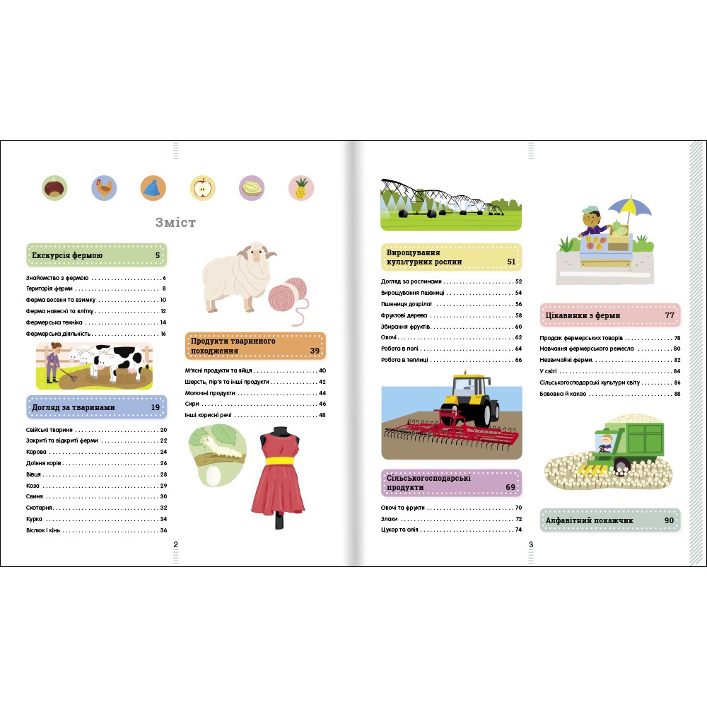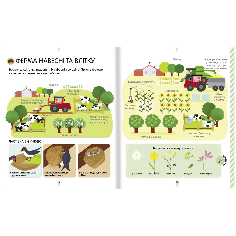 «На фермі» познайомить читача зі справжнім фермерським життям. На читача чекає безліч фактів про побут та заняття у господарстві. Хто живе та росте на фермі? Які працівники доглядають за тваринами та рослинами? Які продукти там виготовляють? Як змінюється господарство у різні пори року? Читач подорожуватиме фермами різних країн світу, дізнаючись про особливості кожного регіону.