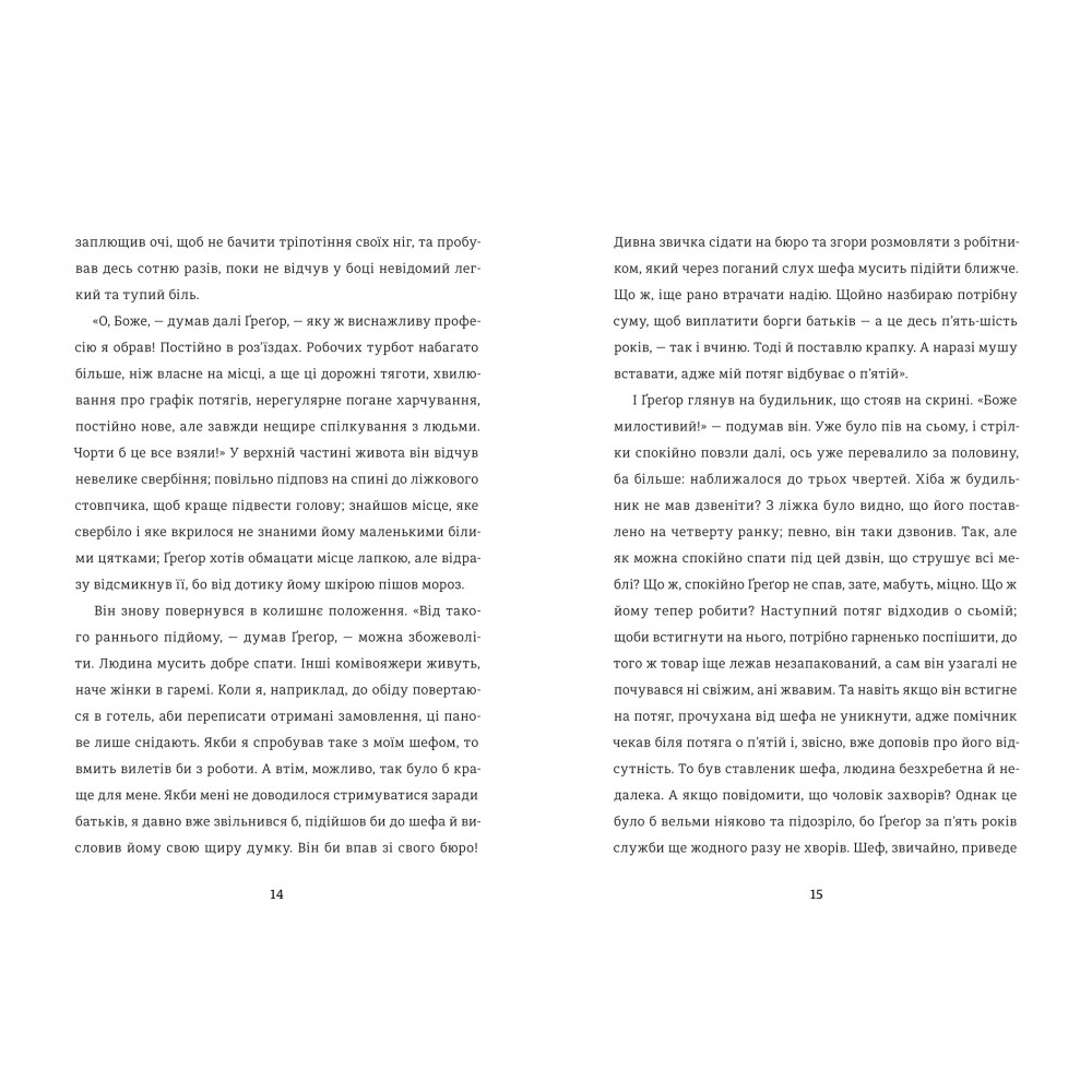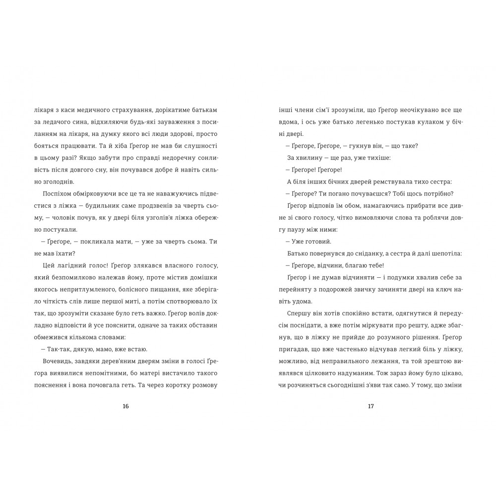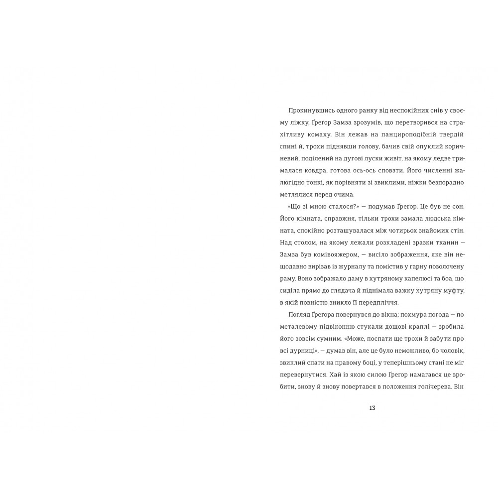 «Коли Грегор Замза прокинувся одного ранку від тривожних снів, виявилося, що він перетворився на гігантську комаху. Підняв голову і побачив свій коричневий живіт, розділений на жорсткі дугоподібні сегменти, на яких ковдра ледь трималася й збиралася зісковзнути» – із цього вражаючого, дивного, але напрочуд кумедного тексту Кафка починає свій твір "Перетворення".