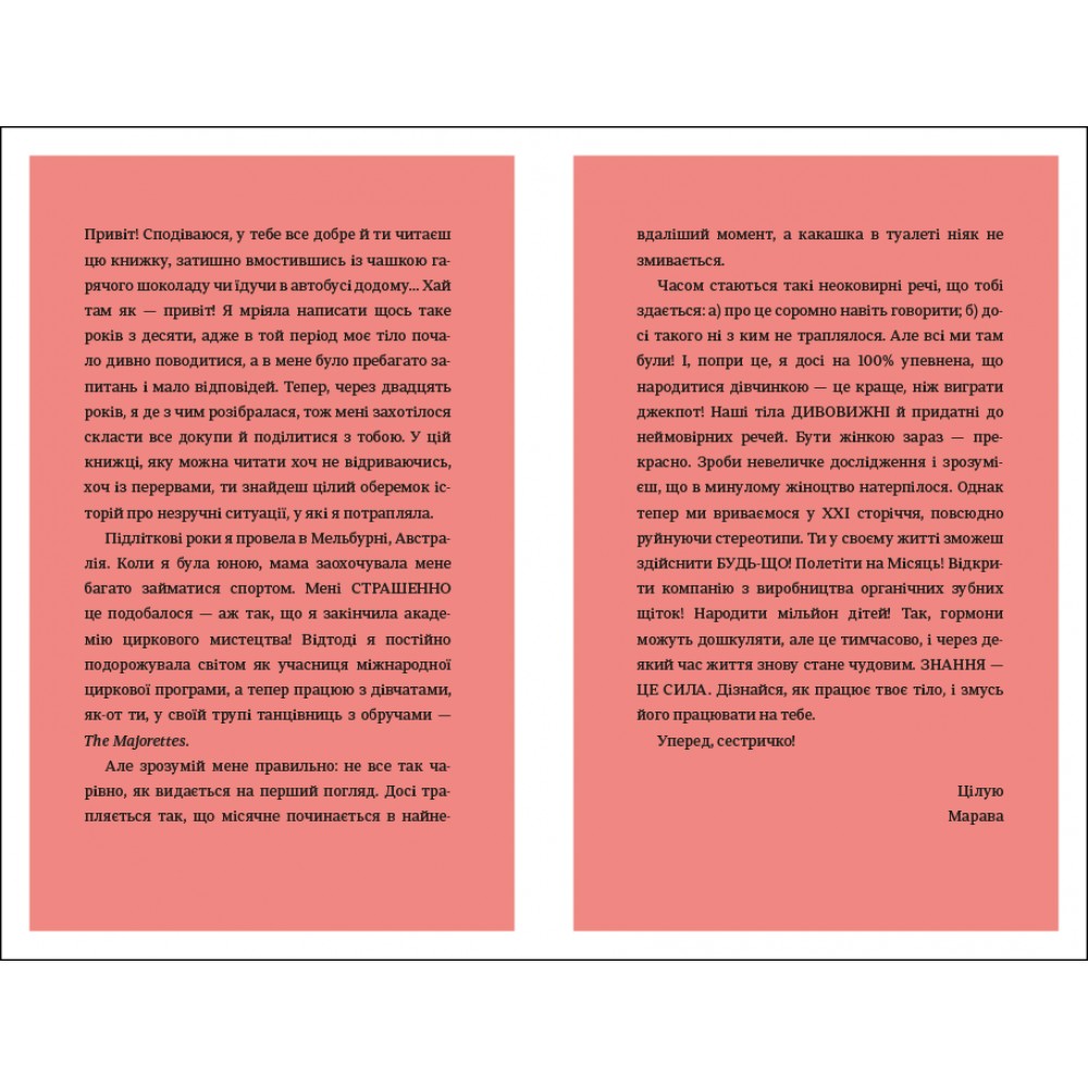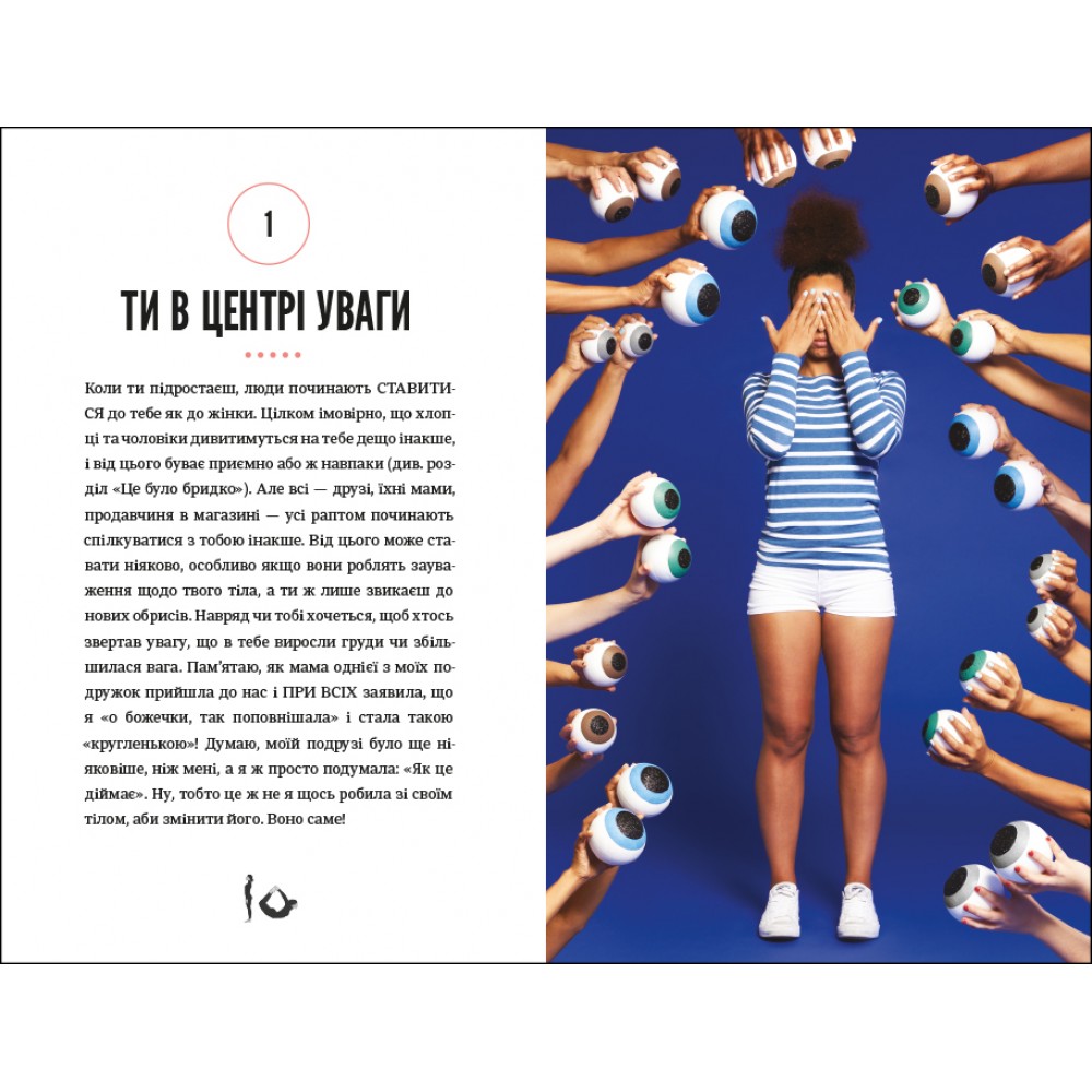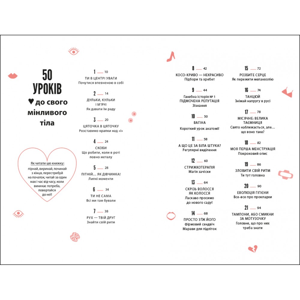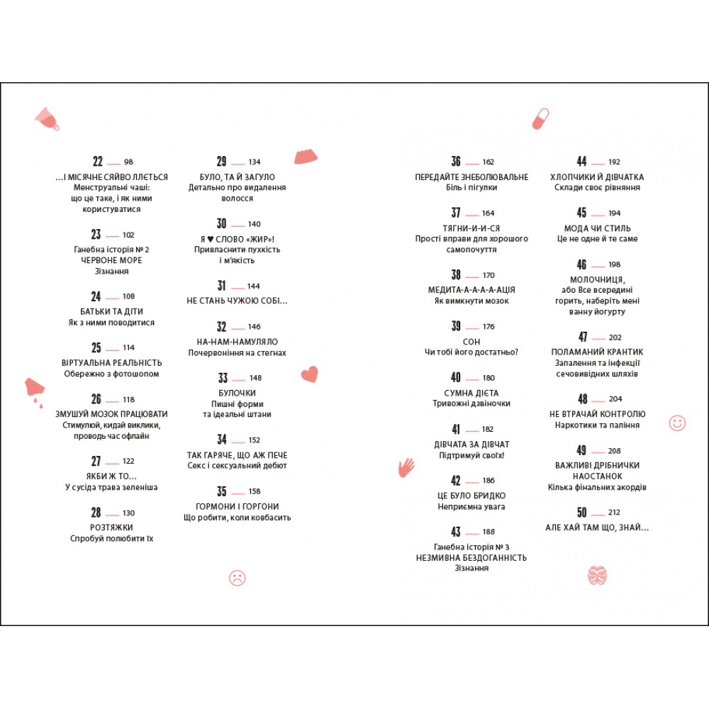 Зокрема тут можна прочитати про те, як вибрати перший бюстгалетр, що варто знати про перші місячні, як доглядати за шкірою обличчя, як дати раду з надмірним потовиділенням, що робити, коли доводиться носити брекети, а ще, як харчуватись, як рухатись, скільки спати, про особисту гігієну, а ще про стосунки батьками у цей період, стосунки з друзями, як проявляти свої почуття і переживати, коли хтоcь не відповідає взаємністю, про гормони та емоційний інтелект і як з гумором ставитись до неприємностей, які зі всіма трапляються.