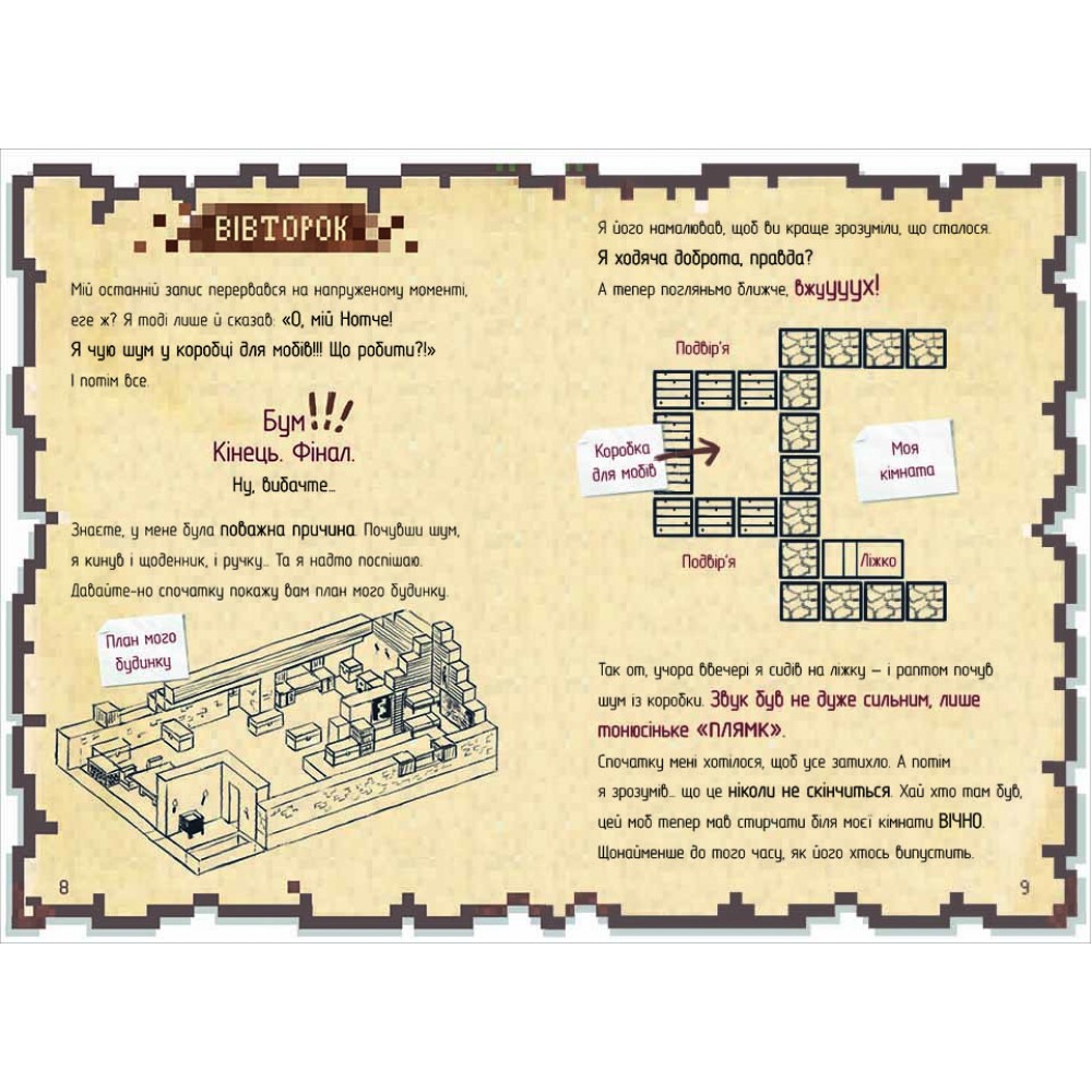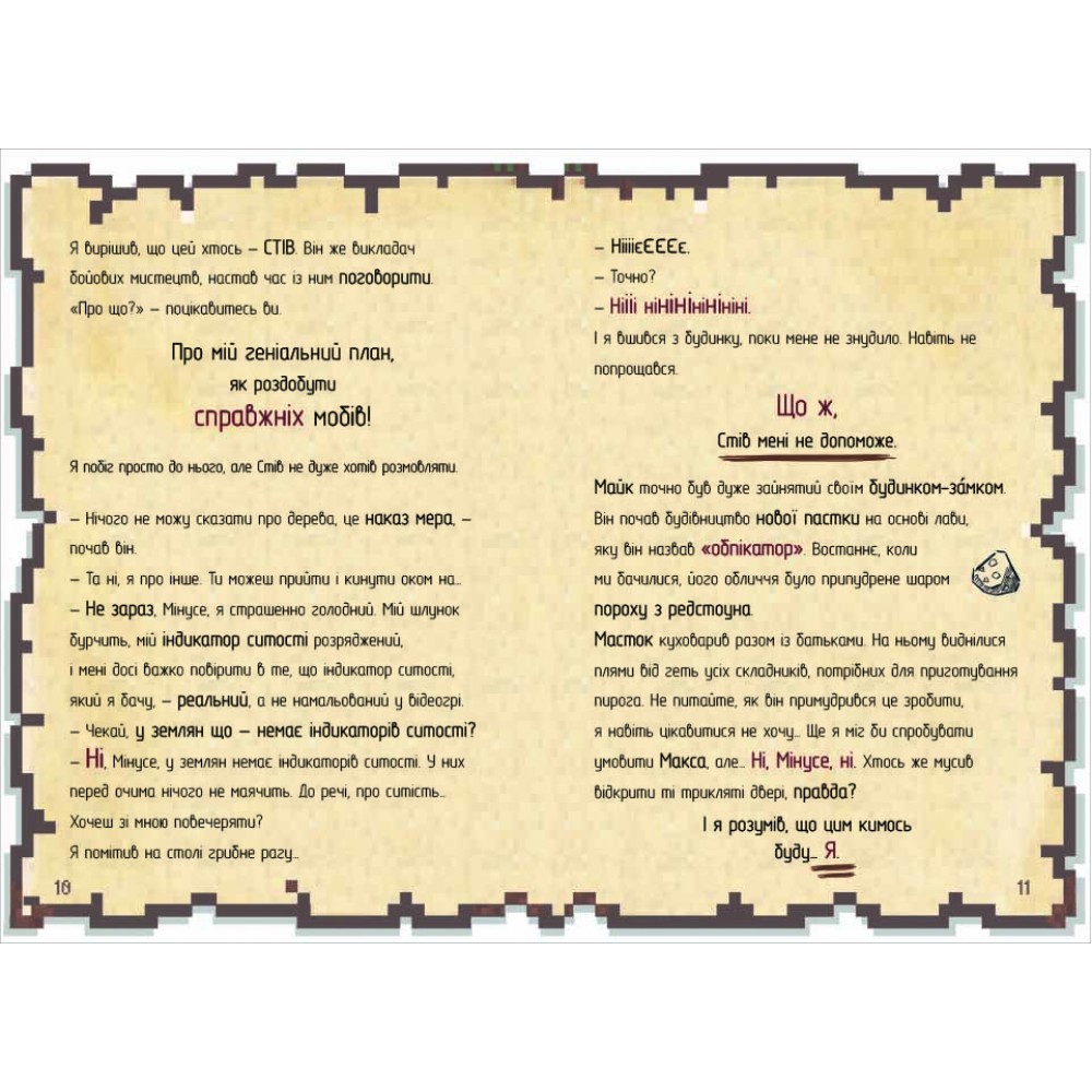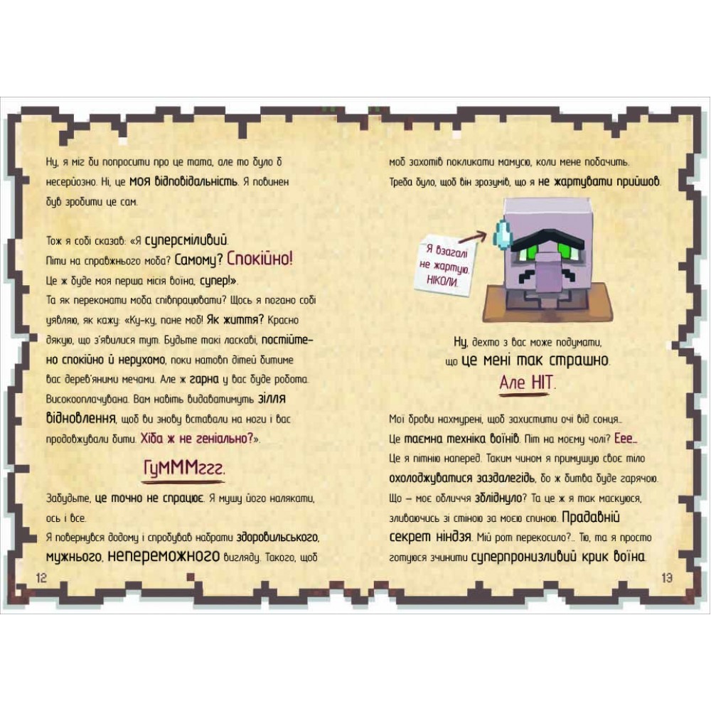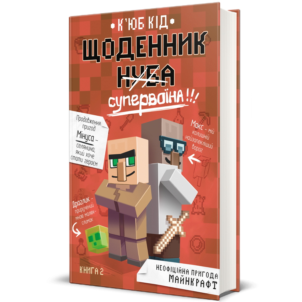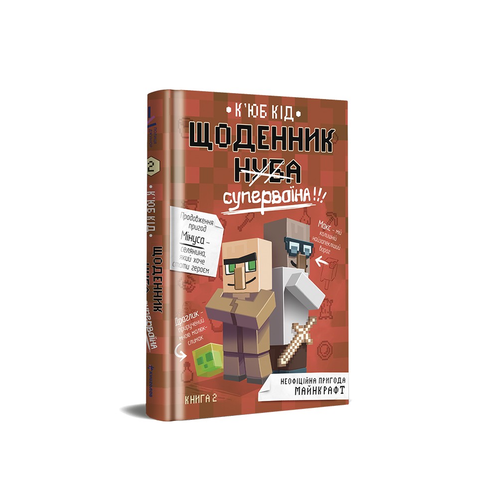 Пригоди у країні Майнкрафтії продовжуються. У другій книжці з ілюстрованої серії К’юб Кіда йдеться про пригоди дванадцятирічного Мінуса, який мріє стати супервоїном. Йому з друзями доведеться пройти різноманітні випробування, наприклад, зустрітися із страшнючими зомбі, одягненими в бронежилети. Хлопця ще й почне переслідувати у школі дивна дівчина, куди б він не пішов, вона теж там з’являється. Але згодом з’ясується, що у неї немає злих намірів, зрештою, вони стануть союзниками, щоб захистити свою школу від нападу мобів. Чи Мінуста його друзі зможуть впоратися і перемогти ватажка мобів? Мінусмусить зібрати всю свою мужність, щоб протистояти небезпеці та захистити селян. Буде цікава не тільки прихильниками гри Minecraft, а й любителям пригодницьких історій.