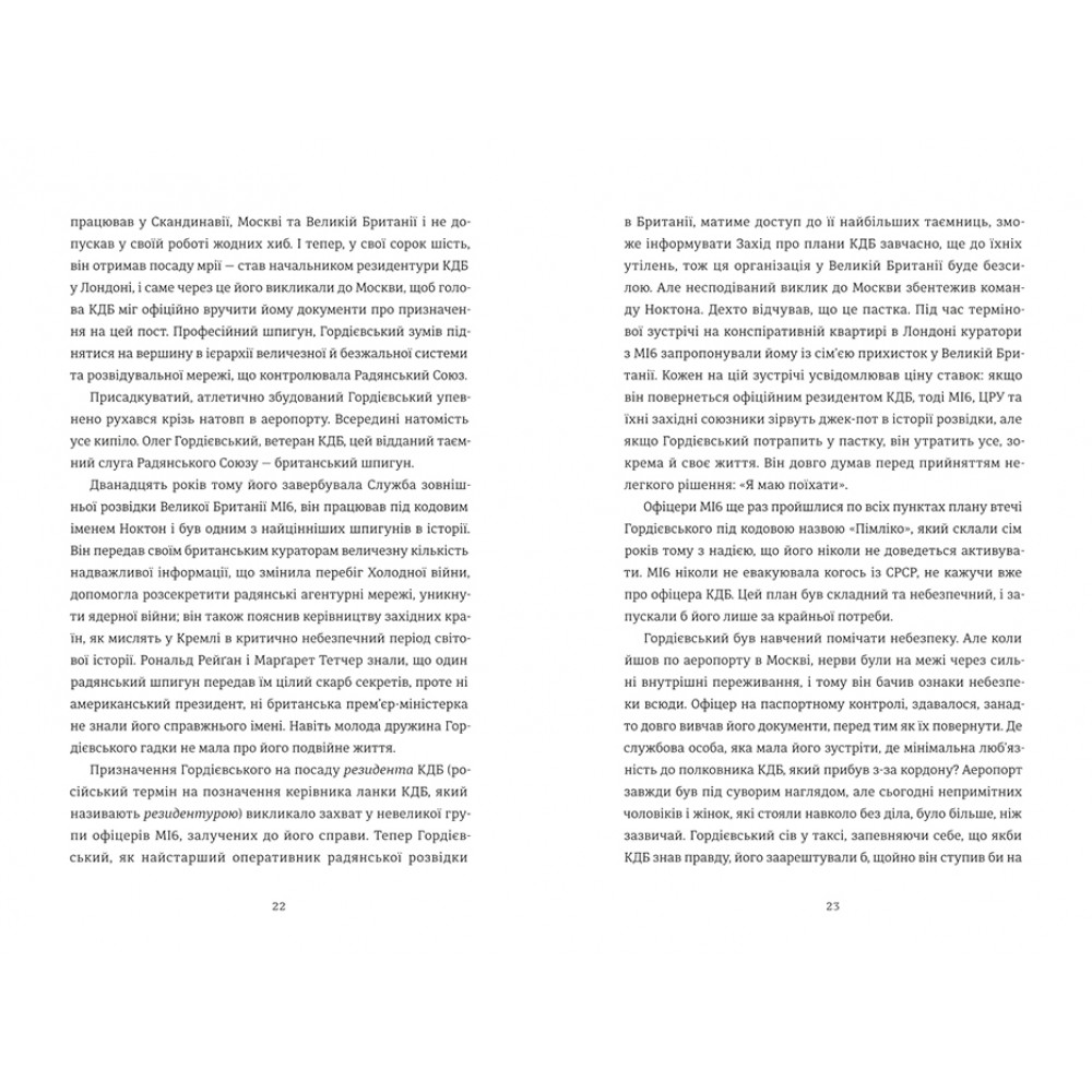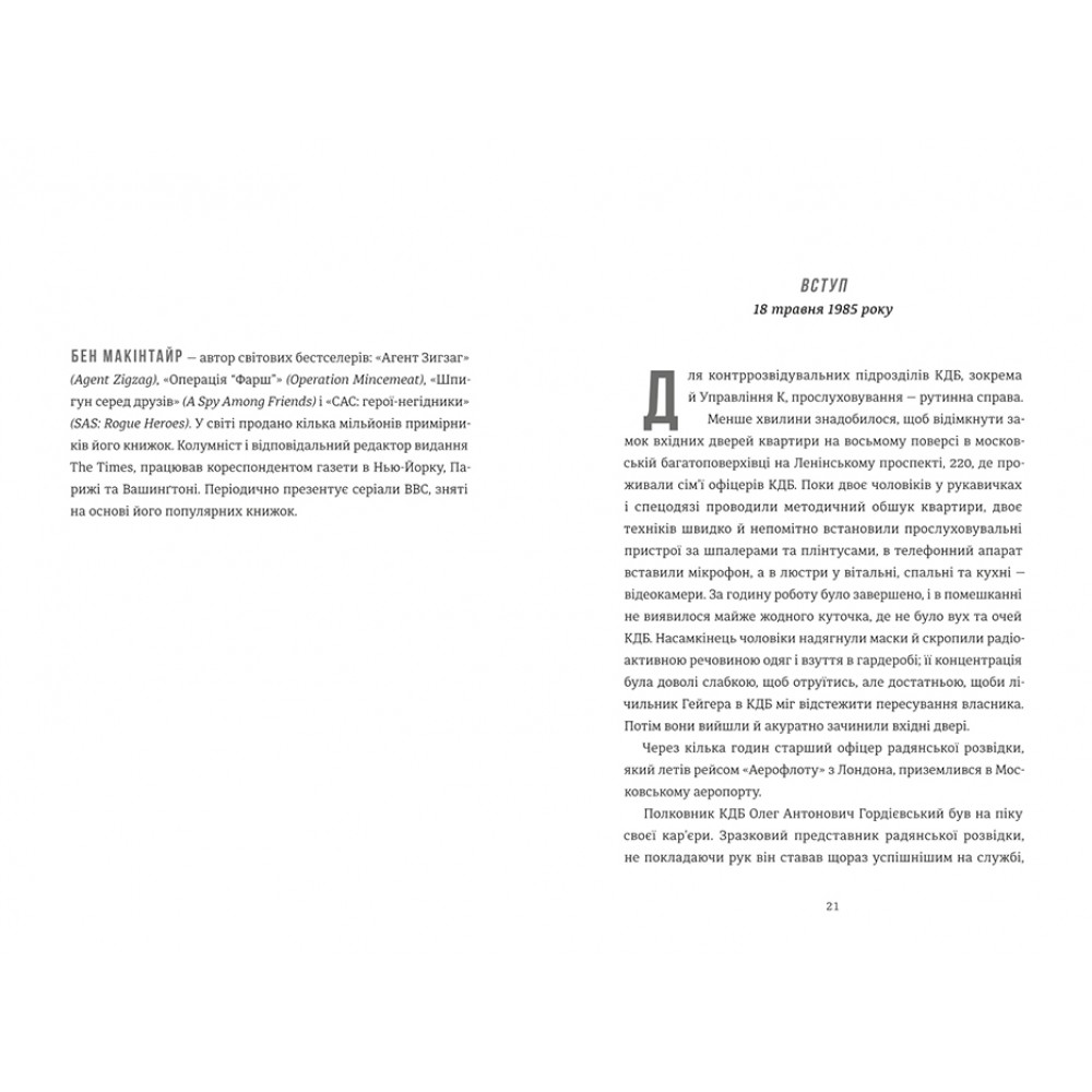«Цю книжку не було б написано без щиросердної підтримки та співпраці з її героєм. Понад три роки я записував інтерв’ю з Олегом Гордієвським, у конспіративному будинку ми зустрічалися понад двадцять разів, я записав понад сто годин розмов. Його гостинність була безкінечною, його терпіння — безмежним, а його пам’ять — відмінною. Він співпрацював без жодних умов і не намагався якимось чином вплинути на те, що буде в цій книжці, інтерпретація подій і помилки, які в ній є, — винятково мої», — зазначає Бен Макінтайр.