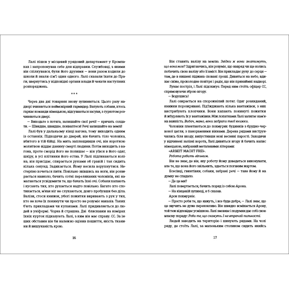 Дебютний роман австралійської письменниці Гізер Морріс про силу кохання, віри й внутрішнього спротиву, завдяки яким можна пройти крізь найтяжчі випробування. Книжку написано на основі реальних подій.