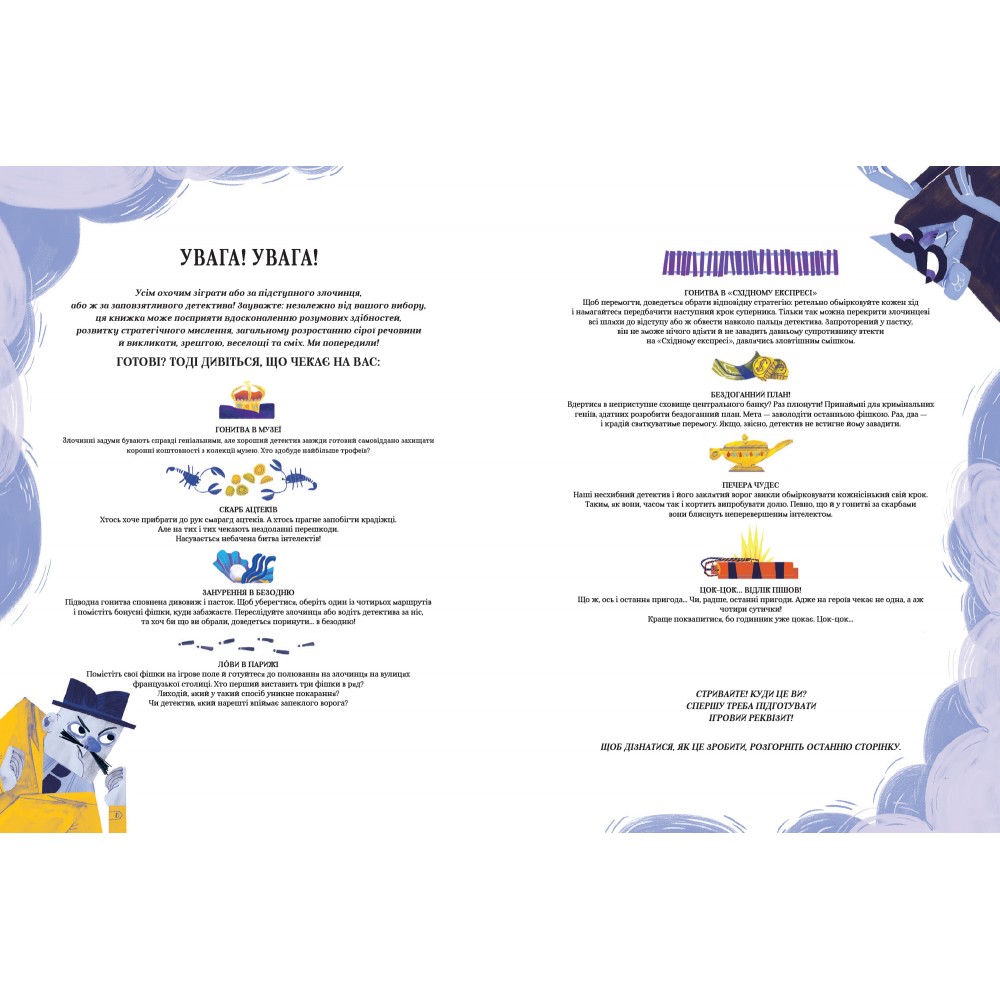 Видання містить вісім логічних і стратегічних настільних ігор: «Гонитва в музеї», «Скарб ацтеків», «Занурення в безодню», «Лови в Парижі», «Гонитва в “Східному експресі”», «Бездоганний план», «Печера чудес» та «Цок-цок… Відлік пішов».