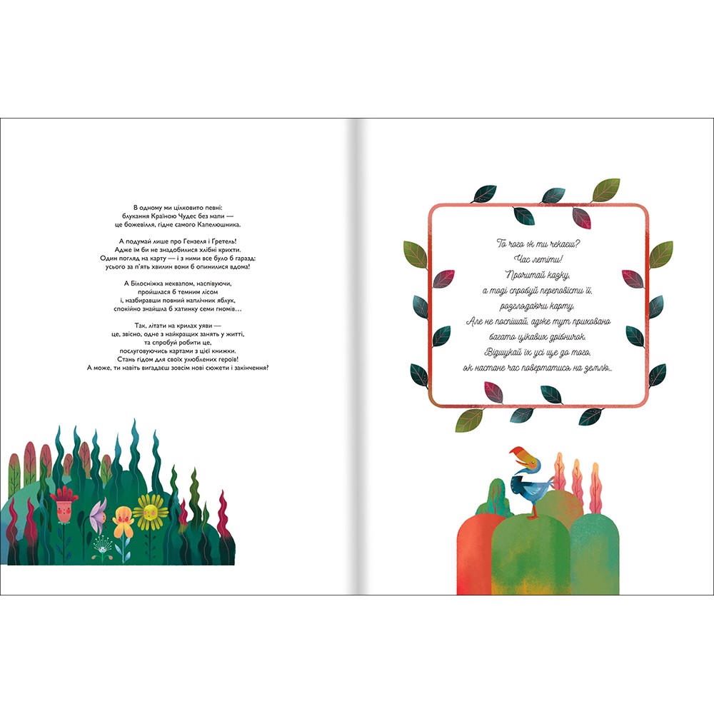 Літати на крилах уяви — це, звісно, одне з найкращих занять у житті, та спробуй робити це, послуговуючись картами з цієї книжки. Стань гідом для своїх улюблених героїв! А може, ти навіть вигадаєш зовсім нові сюжети і закінчення? То чого ж ти чекаєш? Час летіти! Прочитай казку, а тоді спробуй переповісти її, розглядаючи карту. Але не поспішай, адже тут приховано багато цікавих дрібничок. Відшукай їх усі ще до того, як настане час повертатися на землю… В книжці зібрано 8 казок: «Чарiвник Країни Оз», «Гензель i Ґретель», «Красуня i Чудовисько», «Алiса в Країнi Чудес», «Бiлоснiжка», «Пiтер Пен», «Русалонька», «Пiноккiо».