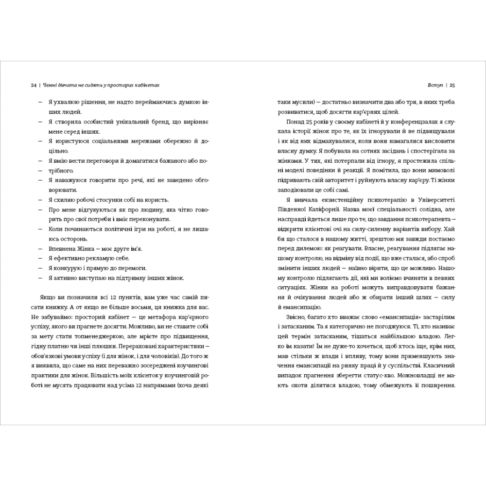 Чому стільки розумних і відповідальних жінок не отримують у кар’єрі того, на що заслуговують? Чому їм соромно просити підвищення чи відповідної зарплатні? Чому вони не можуть відмовитись виконувати додаткові завдання чи працювати понаднормово? Є багато нав’язаних з дитинства установок, які стримують жінок на шляху до успішної кар’єри. «Будь чемною, тихою, слухняною ти ж дівчинка» – кожна жінка колись це чула.