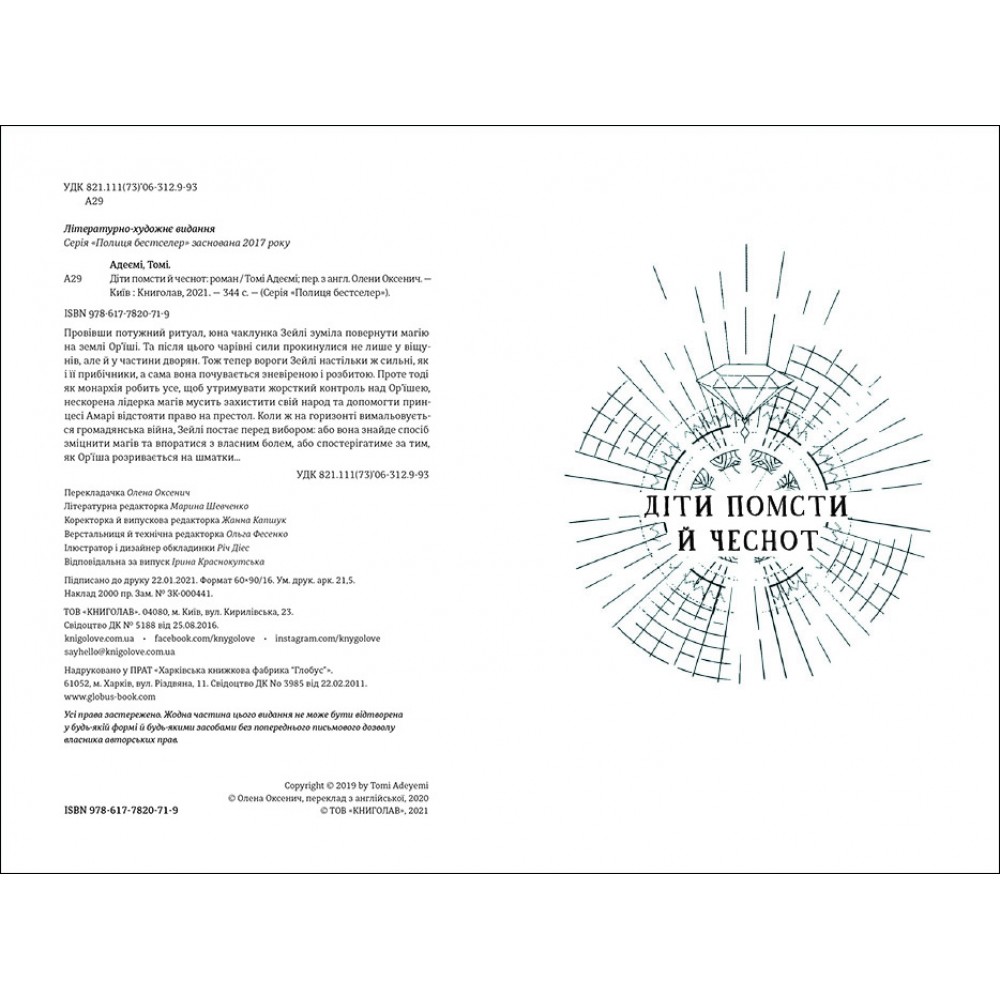 «Діти помсти й чеснот» – друга книжка із трилогії «Спадок Ор’їші»відомої нігерійсько-американської письменниці Томі Адеємі. І це захоплююча історія про світ магів і злих правителів, про боротьбу добра і зла, у якій чимало відгуків і на проблеми сучасного світу.