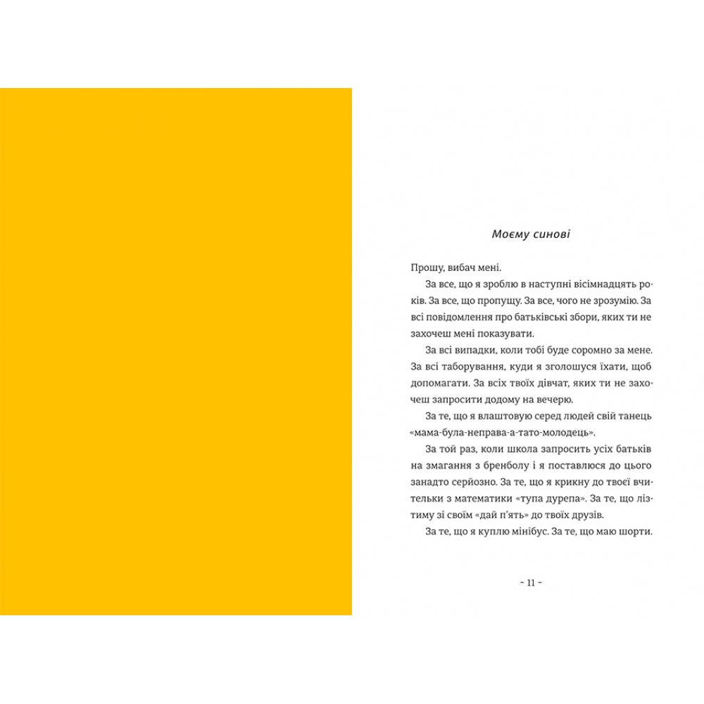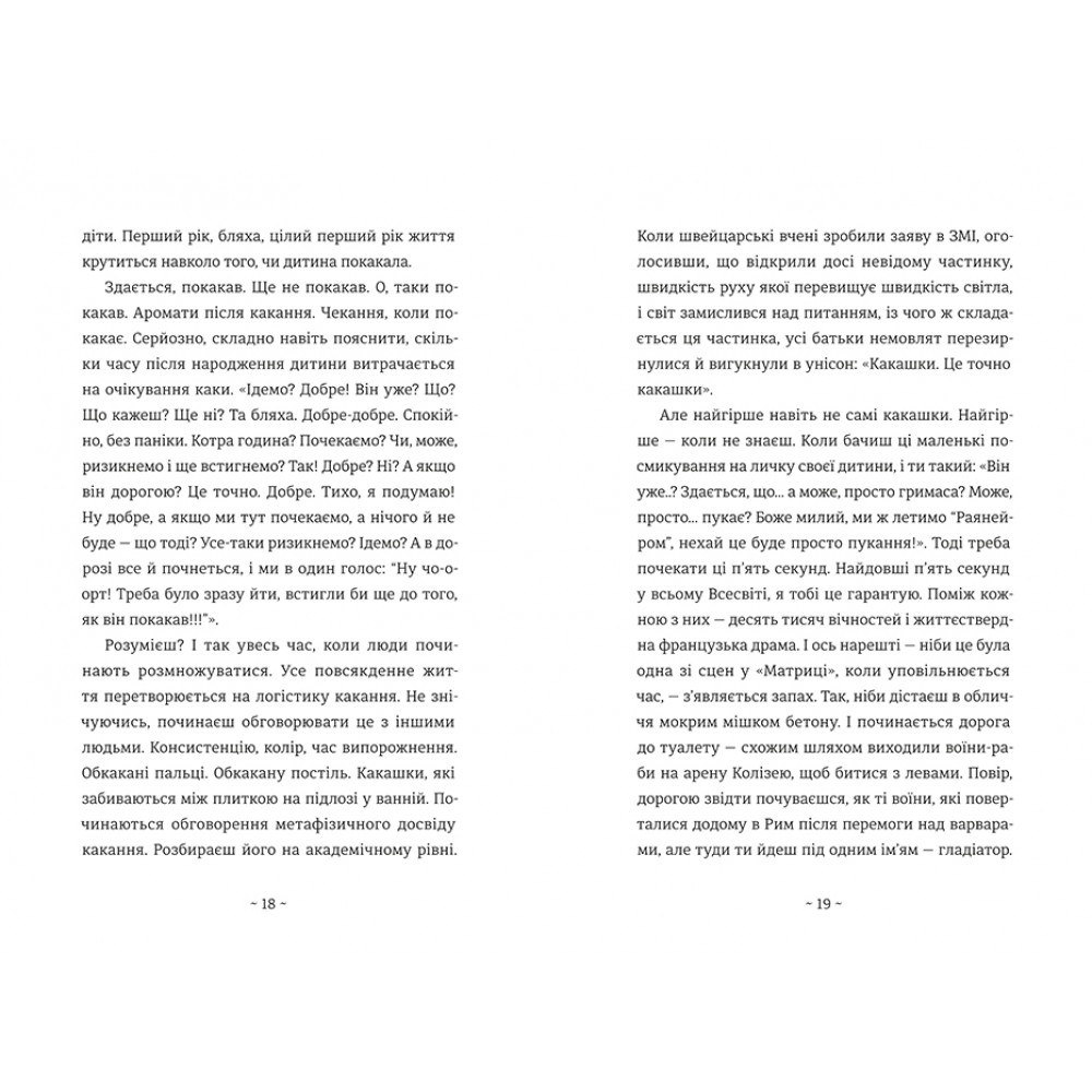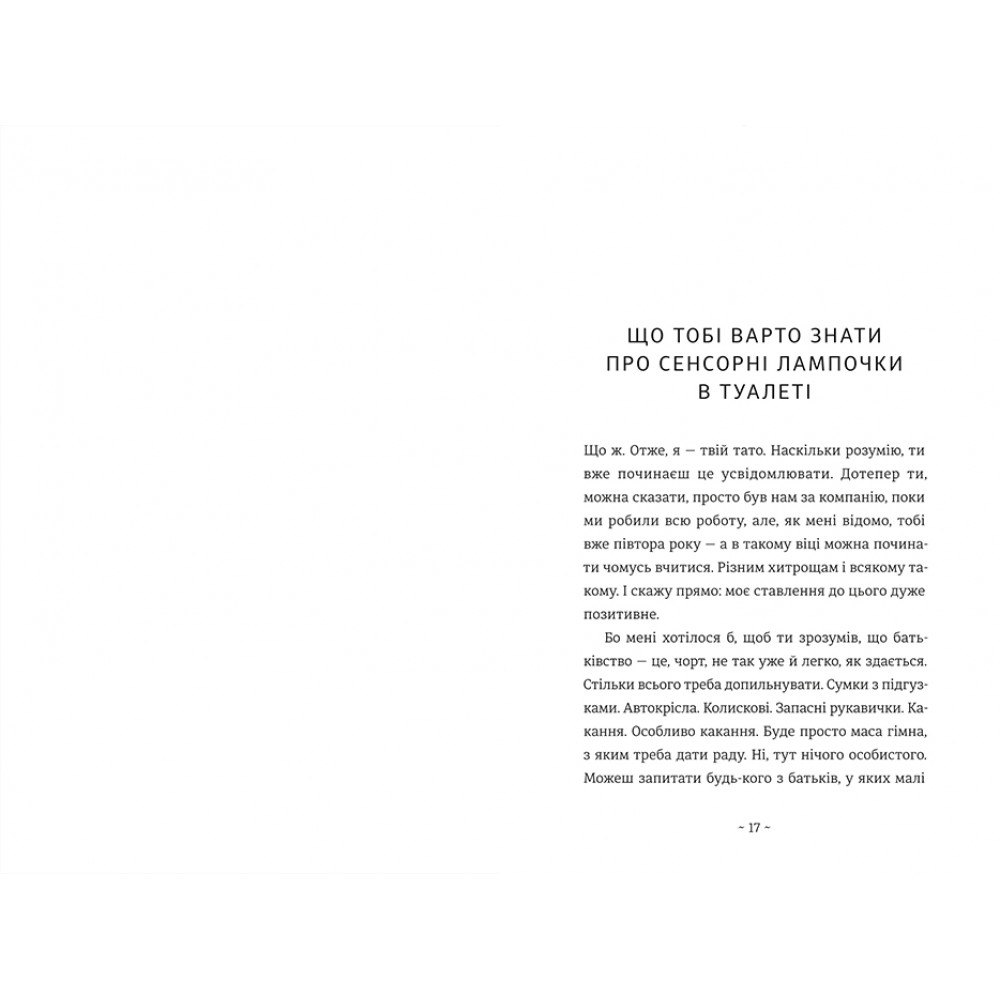В книжці автор ділиться власними роздумами та життєвими уроками про батьківство, які породило в ньому немовля: недоспані ночі, обкакані підгузки, автокрісла, колискові, правила дитячого харчування і розвитку. А скільки ще попереду: друзі, дорослішання, життєві пригоди...
