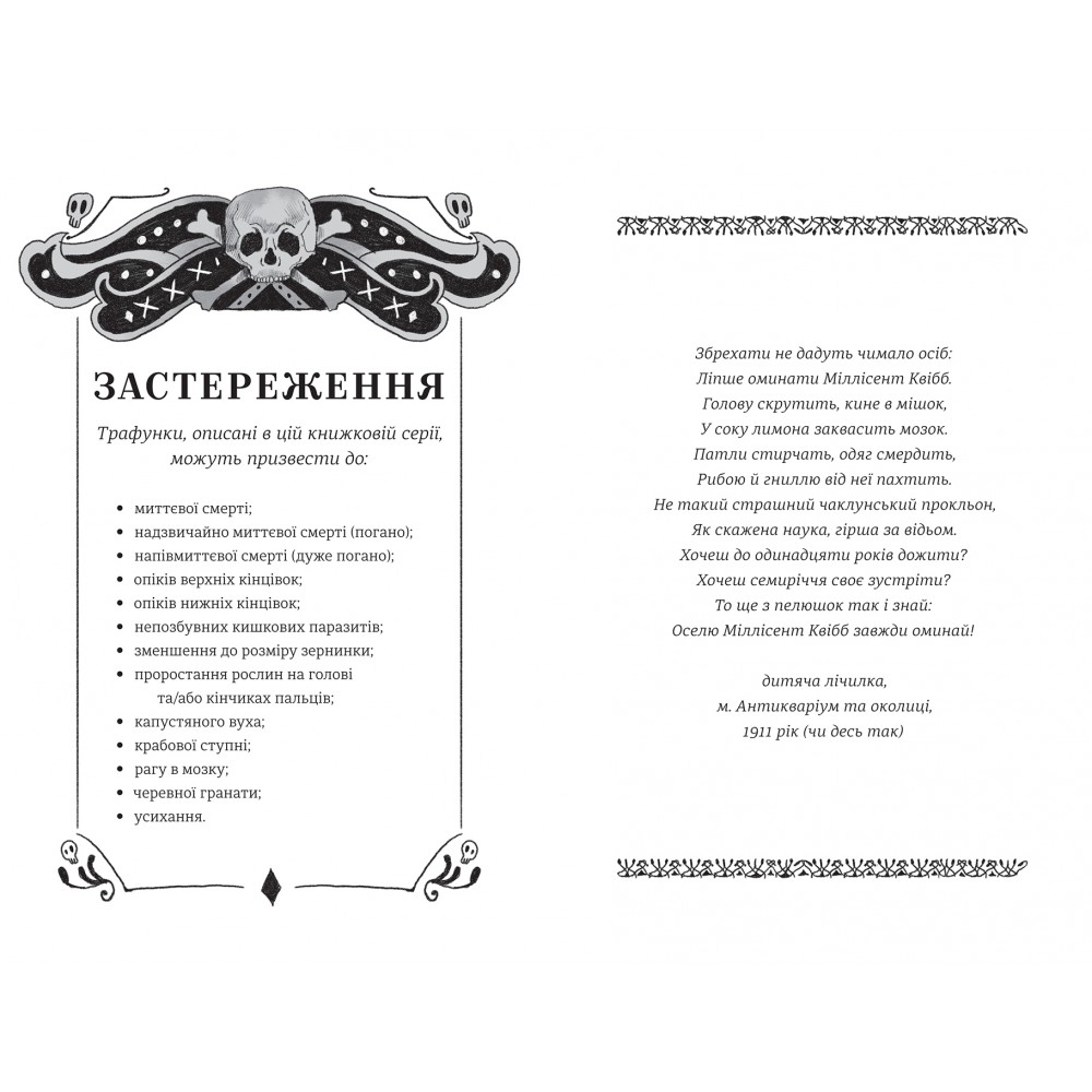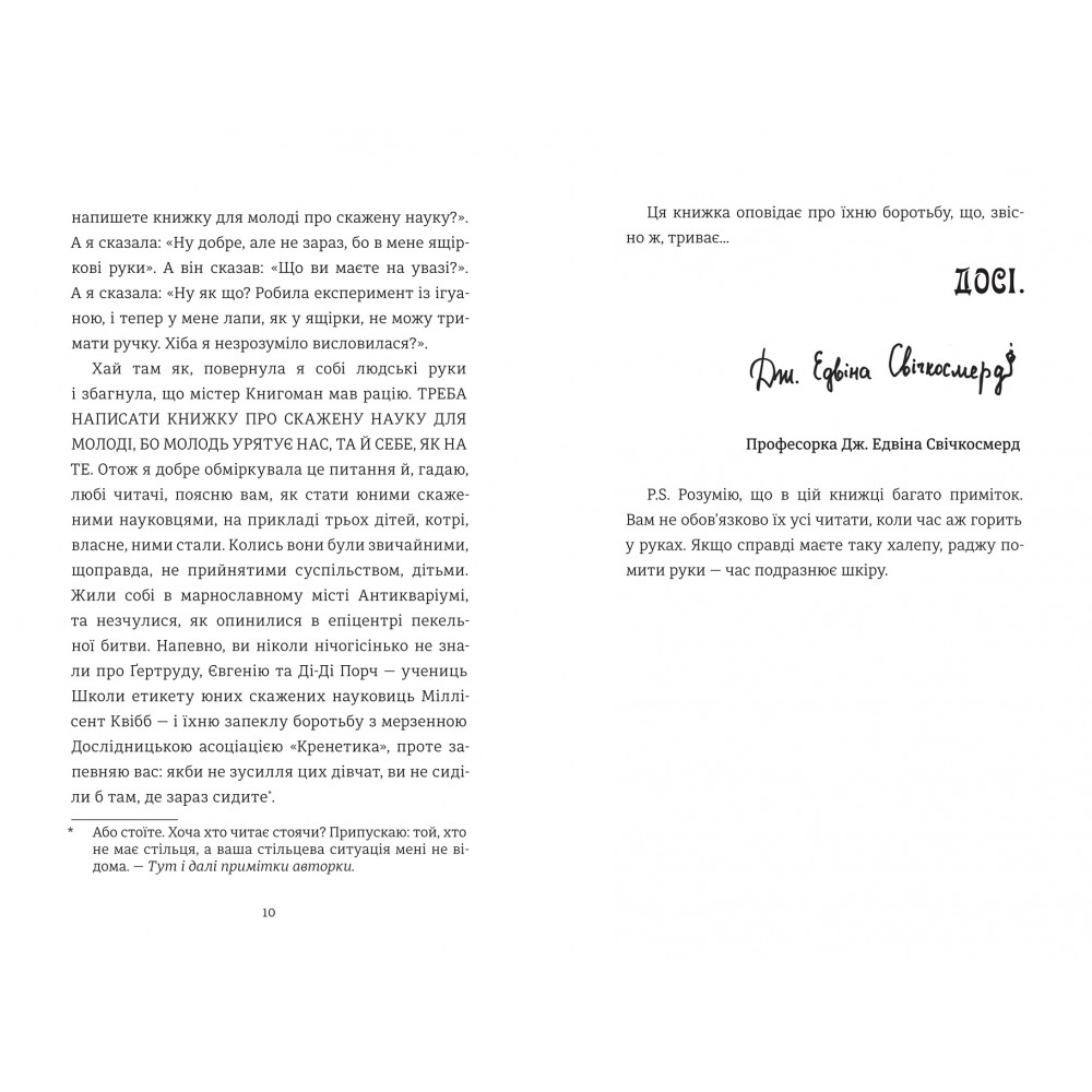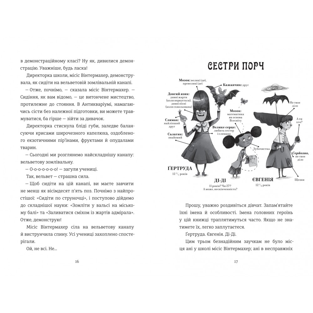 Ніхто на цілім світі, не те що в місті Антикваріум, не мріяв опинитися в руках у Міллісент Квібб — загрозливої, страхітливої, легендарної скаженої науковиці! Та й хто проміняв би захопливі уроки етикету на дивакуваті досліди й польоти на мухоциклі? Хіба що сестрички Порч — Ґертруда, Євгенія та Ді-Ді, яким судилося не просто пізнати скажену науку, а й порятувати рідне місто від зловісних змовників.